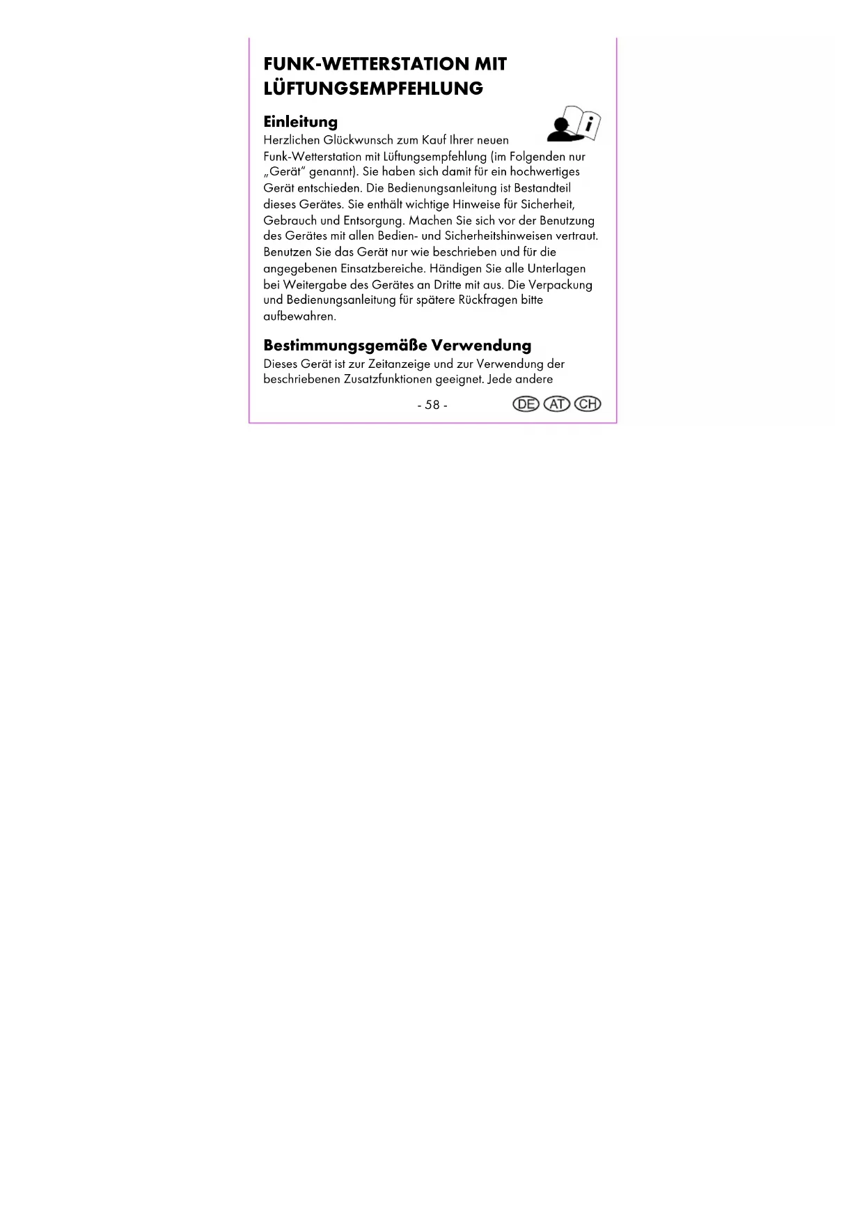 Supplier Please note that the following address is not a service address. Please first contact the service address (see above). digi-tech gmbh Valterweg 27A 65817 Eppstein GERMANY- 55 - Bedienungs- und Sicherheitshinweise Inhaltsverzeichnis Inhaltsverzeichnis .................................................................... - 55 - Einleitung ................................................................................. - 58 - Bestimmungsgemäße Verwendung ....................................... - 58 - Lieferumfang ............................................................................ - 59 - Technische Daten .................................................................... - 60 - Gerät ................................................................................. - 60 - Funk-Außensensor ............................................................ - 60 - Zeichenerklärung .................................................................... - 61 - Wichtige Sicherheitshinweise Wichtige SicherheitshinweiseWichtige Sicherheitshinweise Wichtige Sicherheitshinweise ............................................. - 64 - Sicherheitshinweise für Benutzer ..................................... - 64 - Sicherheitshinweise zu den Batterien .............................. - 65 - Das Gerät sicher aufhängen oder -stellen ............................ - 69 - Den Außensensor sicher aufhängen oder -stellen ............... - 70 - Display und Bedienfelder ....................................................... - 72 - Gerät ................................................................................. - 72 - Funk-Außensensor ............................................................ - 75 -- 56 - Inbetriebnahme ....................................................................... - 76 - Schnelleinstellung ................................................................... - 78 - Grundeinstellung ..................................................................... - 79 - Zeitzonenanpassung .............................................................. - 79 - Funkempfang........................................................................... - 80 - Funkempfangsstörung ...................................................... - 80 - Funkempfang aus- und anschalten ................................. - 81 - Funkempfang neustarten .................................................. - 83 - Licht .......................................................................................... - 83 - 12-/24-Stunden-Zeitformat .................................................. - 83 - Temperatur .............................................................................. - 84 - Weckalarm .............................................................................. - 84 - Weckalarm einstellen ....................................................... - 84 - Weckalarm aktivieren und deaktivieren ......................... - 85 - Schlummerfunktion (SNOOZE) ....................................... - 86 - Funk-Außensensor/Kanaleinstellung .................................... - 86 - Lüftungsbewertung .................................................................. - 88 - Raumklimabewertung ............................................................. - 89 - Lüftungsempfehlung ................................................................ - 90 - Schimmelalarm ....................................................................... - 90 - Schimmelalarm einstellen ................................................. - 90 -- 57 - Schimmelalarm aktivieren und deaktivieren ................... - 91 - Maximal- und Minimalwerte ................................................. - 92 - Batteriestandsanzeige ............................................................ - 93 - Neustart (RESET) ..................................................................... - 93 - Reinigungshinweis .................................................................. - 94 - Lagerung.................................................................................. - 94 - Vereinfachte EU-Konformitätserklärung ................................ - 94 - Entsorgung............................................................................... - 95 - Entsorgung des Elektrogeräts .......................................... - 96 - Entsorgung der Batterien .................................................. - 99 - Recycling .........................................................................- 102 - Müllentsorgung ...............................................................- 102 - Garantie der digi-tech gmbh ...............................................- 103 - Garantiebedingungen ...................................................- 103 - Garantiezeit und gesetzliche Mängelansprüche.........- 104 - Garantieumfang .............................................................- 104 - Abwicklung im Garantiefall ...........................................- 105 - Bestell-Service .......................................................................- 107 - Service ...................................................................................- 107 - Lieferant .................................................................................- 109 -- 58 - FUNK-WETTERSTATION MIT LÜFTUNGSEMPFEHLUNG Einleitung Herzlichen Glückwunsch zum Kauf Ihrer neuen Funk-Wetterstation mit Lüftungsempfehlung (im Folgenden nur „Gerät“ genannt). Sie haben sich damit für ein hochwertiges Gerät entschieden. Die Bedienungsanleitung ist Bestandteil dieses Gerätes. Sie enthält wichtige Hinweise für Sicherheit, Gebrauch und Entsorgung. Machen Sie sich vor der Benutzung des Gerätes mit allen Bedien- und Sicherheitshinweisen vertraut. Benutzen Sie das Gerät nur wie beschrieben und für die angegebenen Einsatzbereiche. Händigen Sie alle Unterlagen bei Weitergabe des Gerätes an Dritte mit aus. Die Verpackung und Bedienungsanleitung für spätere Rüc