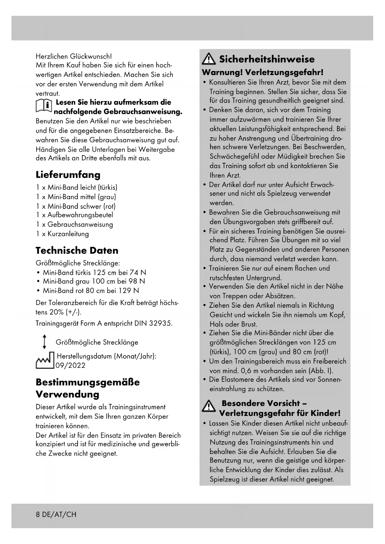 - Mini-Band rot 80 cm bei 129 N Der Toleranzbereich für die Kraft beträgt höchs- tens 20% (+/-). Trainingsgerät Form A entspricht DIN 32935. Größtmögliche Strecklänge Herstellungsdatum (Monat/Jahr): 09/2022 Bestimmungsgemäße Verwendung Dieser Artikel wurde als Trainingsinstrument entwickelt, mit dem Sie Ihren ganzen Körper trainieren können. Der Artikel ist für den Einsatz im privaten Bereich konzipiert und ist für medizinische und gewerbli- che Zwecke nicht geeignet.9DE/AT/CH Gefahren durch Verschleiß