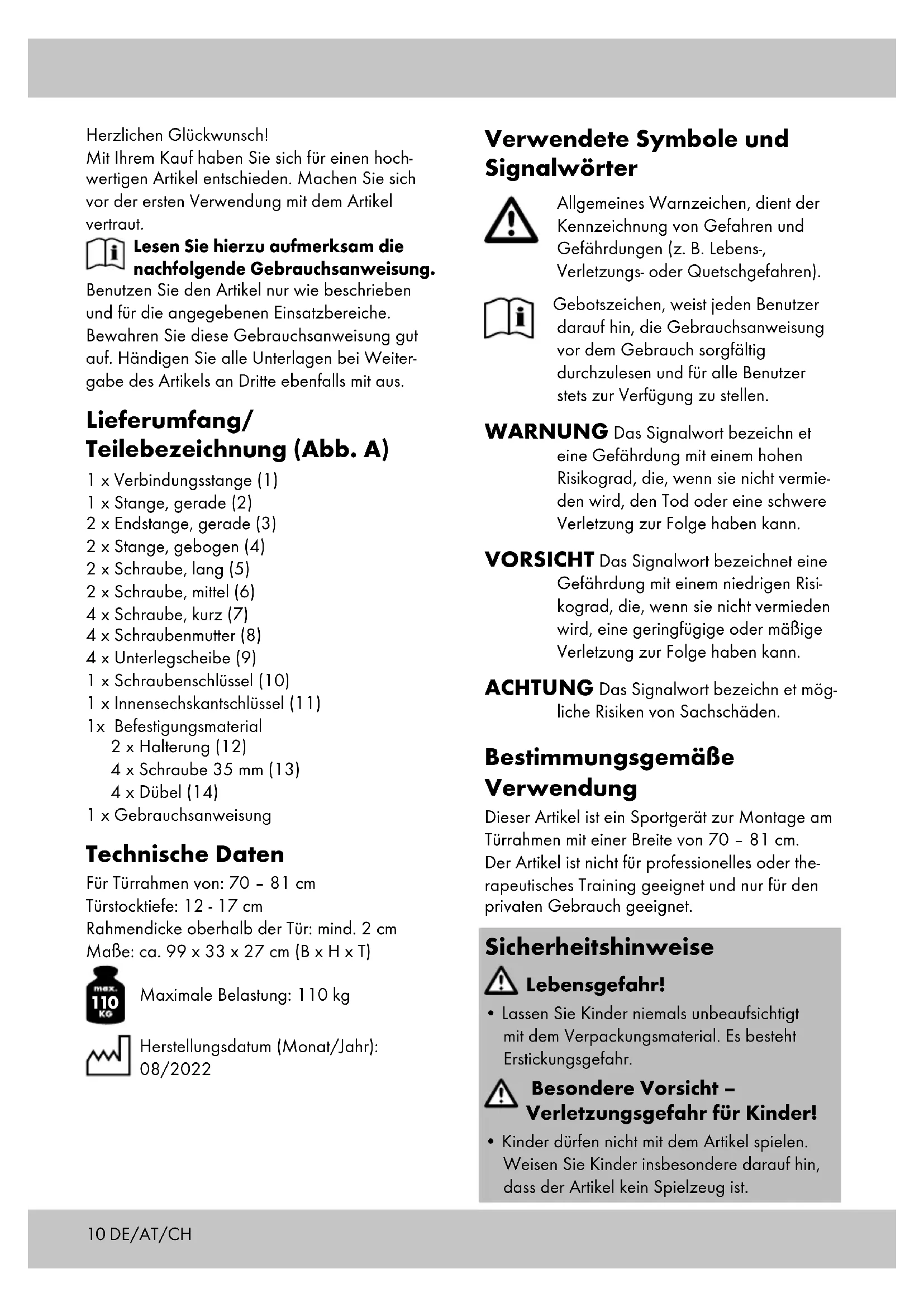 Maximale Belastung: 110 kg Herstellungsdatum (Monat/Jahr): 08/2022 Verwendete Symbole und Signalwörter Allgemeines Warnzeichen, dient der Kennzeichnung von Gefahren und Gefährdungen (z. B. Lebens-, Verletzungs- oder Quetschgefahren). Gebotszeichen, weist jeden Benutzer darauf hin, die Gebrauchsanweisung vor dem Gebrauch sorgfältig durchzulesen und für alle Benutzer stets zur Verfügung zu stellen. WARNUNG Das Signalwort bezeichn et eine Gefährdung mit einem hohen Risikograd, die, wenn sie nicht vermie- den wird, den Tod oder eine schwere Verletzung zur Folge haben kann. VORSICHT Das Signalwort bezeichnet eine Gefährdung mit einem niedrigen Risi- kograd, die, wenn sie nicht vermieden wird, eine geringfügige oder mäßige Verletzung zur Folge haben kann. ACHTUNG Das Signalwort bezeichn et mög- liche Risiken von Sachschäden. Bestimmungsgemäße Verwendung Dieser Artikel ist ein Sportgerät zur Montage am Türrahmen mit einer Breite von 70 – 81 cm. Der Artikel ist nicht für professionelles oder the- rapeutisches Training geeignet und nur für den privaten Gebrauch geeignet. Sicherheitshinweise Lebensgefahr!