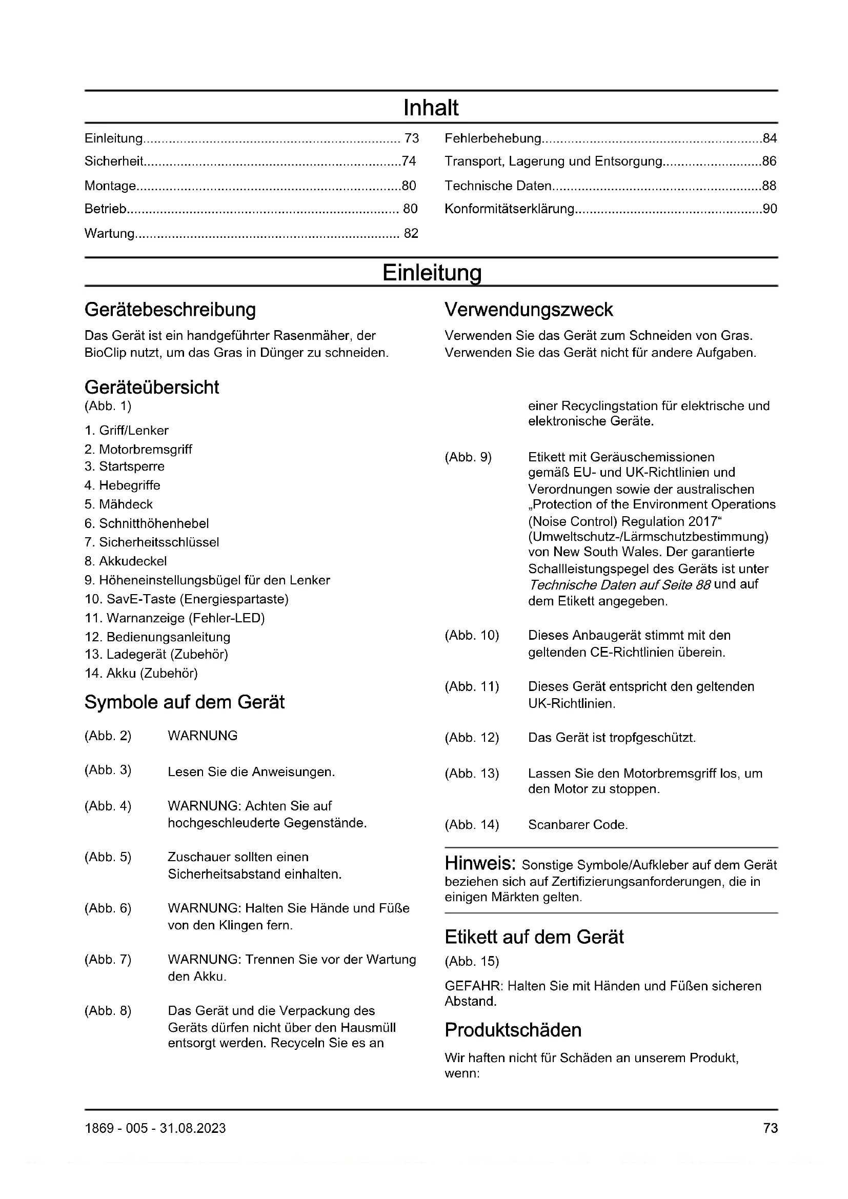 - Konformitätserklärung Einleitung Gerätebeschreibung Das Gerät ist ein handgeführter Rasenmäher, der BioClip nutzt, um das Gras in Dünger zu schneiden. Verwendungszweck Verwenden Sie das Gerät zum Schneiden von Gras. Verwenden Sie das Gerät nicht für andere Aufgaben. Geräteübersicht (Abb. 1) p. 90