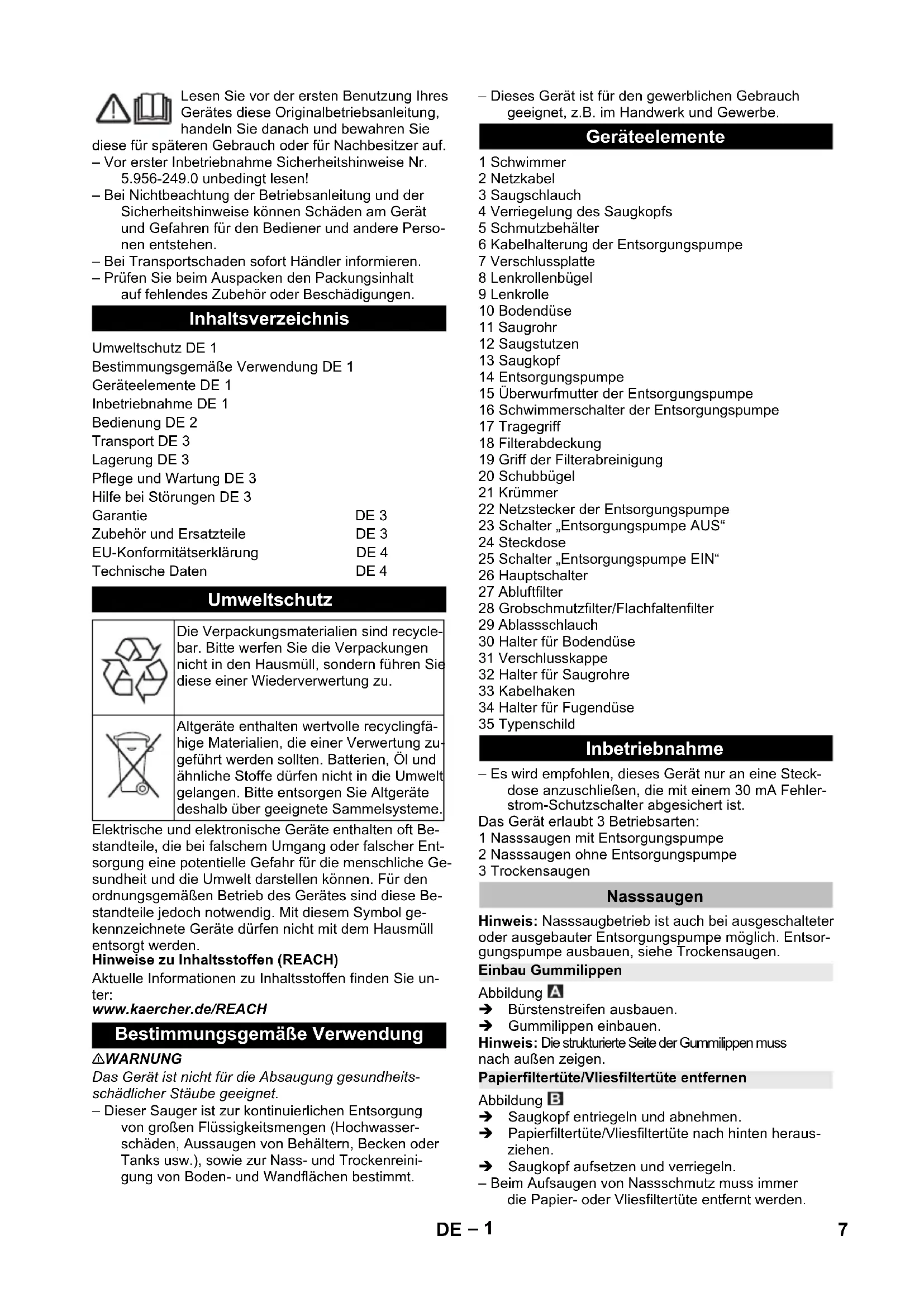6– 1 Lesen Sie vor der ersten Benutzung Ihres Gerätes diese Originalbetriebsanleitung, handeln Sie danach und bewahren Sie diese für späteren Gebrauch oder für Nachbesitzer auf. – Vor erster Inbetriebnahme Sicherheitshinweise Nr. 5.956-249.0 unbedingt lesen! – Bei Nichtbeachtung der Betriebsanleitung und der Sicherheitshinweise können Schäden am Gerät und Gefahren für den Bediener und andere Perso- nen entstehen. – Bei Transportschaden sofort Händler informieren. – Prüfen Sie beim Auspacken den Packungsinhalt auf fehlendes Zubehör oder Beschädigungen. Elektrische und elektronische Geräte enthalten oft Be- standteile, die bei falschem Umgang oder falscher Ent- sorgung eine potentielle Gefahr für die menschliche Ge- sundheit und die Umwelt darstellen können. Für den ordnungsgemäßen Betrieb des Gerätes sind diese Be- standteile jedoch notwendig. Mit diesem Symbol ge- kennzeichnete Geräte dürfen nicht mit dem Hausmüll entsorgt werden. Hinweise zu Inhaltsstoffen (REACH) Aktuelle Informationen zu Inhaltsstoffen finden Sie un- ter: www.kaercher.de/REACH 몇 WARNUNG Das Gerät ist nicht für die Absaugung gesundheits- schädlicher Stäube geeignet. – Dieser Sauger ist zur kontinuierlichen Entsorgung von großen Flüssigkeitsmengen (Hochwasser- schäden, Aussaugen von Behältern, Becken oder Tanks usw.), sowie zur Nass- und Trockenreini- gung von Boden- und Wandflächen bestimmt. – Dieses Gerät ist für den gewerblichen Gebrauch geeignet, z.B. im Handwerk und Gewerbe. 1 Schwimmer 2 Netzkabel 3 Saugschlauch 4 Verriegelung des Saugkopfs 5 Schmutzbehälter 6 Kabelhalterung der Entsorgungspumpe 7 Verschlussplatte 8 Lenkrollenbügel 9 Lenkrolle 10 Bodendüse 11 Saugrohr 12 Saugstutzen 13 Saugkopf 14 Entsorgungspumpe 15 Überwurfmutter der Entsorgungspumpe 16 Schwimmerschalter der Entsorgungspumpe 17 Tragegriff 18 Filterabdeckung 19 Griff der Filterabreinigung 20 Schubbügel 21 Krümmer 22 Netzstecker der Entsorgungspumpe 23 Schalter „Entsorgungspumpe AUS“ 24 Steckdose 25 Schalter „Entsorgungspumpe EIN“ 26 Hauptschalter 27 Abluftfilter 28 Grobschmutzfilter/Flachfaltenfilter 29 Ablassschlauch 30 Halter für Bodendüse 31 Verschlusskappe 32 Halter für Saugrohre 33 Kabelhaken 34 Halter für Fugendüse 35 Typenschild – Es wird empfohlen, dieses Gerät nur an eine Steck- dose anzuschließen, die mit einem 30 mA Fehler- strom-Schutzschalter abgesichert ist. Das Gerät erlaubt 3 Betriebsarten: 1 Nasssaugen mit Entsorgungspumpe 2 Nasssaugen ohne Entsorgungspumpe 3 Trockensaugen Hinweis: Nasssaugbetrieb ist auch bei ausgeschalteter oder ausgebauter Entsorgungspumpe möglich. Entsor- gungspumpe ausbauen, siehe Trockensaugen. Abbildung Bürstenstreifen ausbauen. Gummilippen einbauen. Hinweis: Die strukturierte Seite der Gummilippen muss nach außen zeigen. Abbildung Saugkopf entriegeln und abnehmen. Papierfiltertüte/Vliesfiltertüte nach hinten heraus- ziehen. Saugkopf aufsetzen und verriegeln. – Beim Aufsaugen von Nassschmutz muss immer die Papier- oder Vliesfiltertüte entfernt werden. Inhaltsverzeichnis Umweltschutz DE 1 Bestimmungsgemäße Verwendung DE 1 Geräteelemente DE 1 Inbetriebnahme DE 1 Bedienung DE 2 Transport DE 3 Lagerung DE 3 Pflege und Wartung DE 3 Hilfe bei Störungen DE 3 Garantie DE 3 Zubehör und Ersatzteile DE 3 EU-Konformitätserklärung DE 4 Technische Daten DE 4 Umweltschutz Die Verpackungsmaterialien sind recycle- bar. Bitte werfen Sie die Verpackungen nicht in den Hausmüll, sondern führen Sie diese einer Wiederverwertung zu. Altgeräte enthalten wertvolle recyclingfä- hige Materialien, die einer Verwertung zu- geführt werden sollten. Batterien, Öl und ähnliche Stoffe dürfen nicht in die Umwelt gelangen. Bitte entsorgen Sie Altgeräte deshalb über geeignete Sammelsysteme. Bestimmungsgemäße Verwendung Geräteelemente Inbetriebnahme Nasssaugen Einbau Gummilippen Papierfiltertüte/Vliesfiltertüte entfernen 7DE– 2 Abbildung Saugkopf entriegeln und abnehmen. Membranfilter entfernen. Saugkopf aufsetzen und verriegeln. – Beim Aufsaugen von Nassschmutz muss immer der Membranfilter entfernt werden. Filterabdeckung öffnen. Flachfaltenfilter herausnehmen. Grobschmutzfilter einbauen. Filterabdeckung schließen, muss hörbar einrasten. Abbildung Verschlusskappe entfernen. Entsorgungsschlauch anschließen (Nennweite 3/ 4“ oder größer). 몇 VORSICHT Örtliche Vorschriften zur Abwasserbehandlung beach- ten. Abbildung Schmutzwasser über Ablassschlauch ablassen. ACHTUNG Beim Saugen darf niemals der Grobschmutzfilter ent- fernt werden. – Nasssaugen ohne Entsorgungspumpe: Es emp- fiehlt sich eine Spezialfiltertüte (nass) zu verwen- den (siehe Filtersysteme). – Bei Erreichen des max. Flüssigkeitsstands schaltet das Gerät automatisch ab. – Nach Beendigung des Nasssaugens: Schwimmer, Behälter und gegebenenfalls Entsorgungspumpe mit einem feuchten Tuch reinigen und trocknen. ACHTUNG Vor dem Trockensaugen: Entsorgungspumpe ausbau- en und Flachfaltenfilter einbauen. Hinweis: Beim Trockensaugen muss generell ein Flachfaltenfilter verwendet werden. ACHTUNG Beim Saugen darf niemals der Flachfaltenfilter entfernt werden. – Beim Aufsaugen von Feinstaub kann zusätzlich eine Papierfiltertüte, eine Vliesfiltertüte oder ein Membranfilter verwendet werden. Netzstecker der Entsorgungspumpe ausstecken. Saugkopf entriegeln und abnehmen. Abbildung Überwurfmutter der Entsorgungspumpe abschrau- ben. Kabelhalterung der Entsorgungspumpe heraus- nehmen und durch Verschlussplatte ersetzen. Entsorgungspumpe und Kunststoffeinsatz gleich- zeitig aus dem Behälter herausnehmen, da der Schwimmerschalter der Entsorgungspumpe am Kunststoffeinsatz befestigt ist und sonst beschä- digt werden könnte. Abbildung Verschlusskappe anstelle des Entsorgungs- schlauchs anbringen. Saugkopf aufsetzen und verriegeln. Hinweis: Ein Flachfaltenfilter ist nicht im Lieferumfang enthalten. Filterabdeckung öffnen. Grobschmutzfilter herausnehmen. Flachfaltenfilter einbau