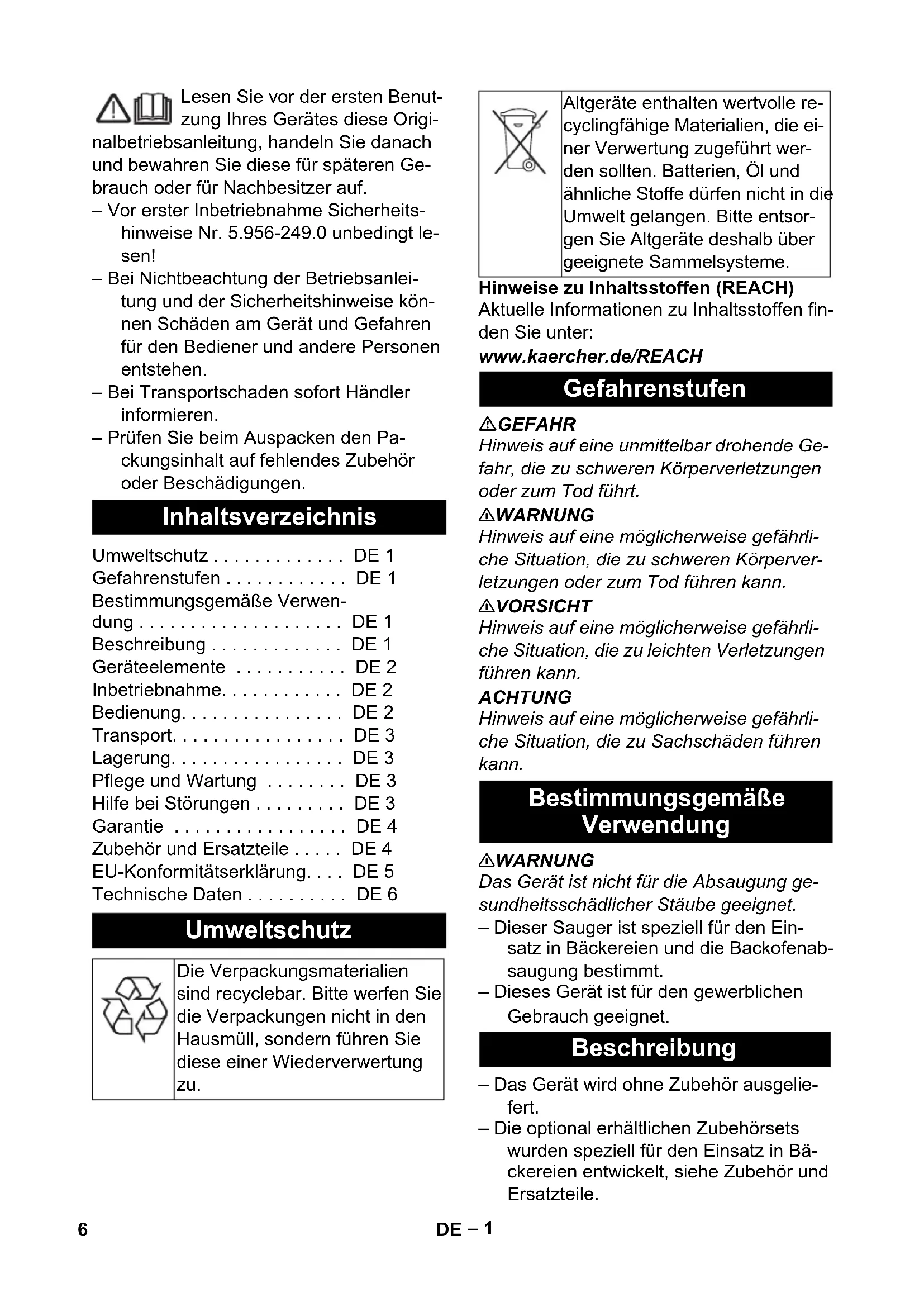 5– 1 Lesen Sie vor der ersten Benut- zung Ihres Gerätes diese Origi- nalbetriebsanleitung, handeln Sie danach und bewahren Sie diese für späteren Ge- brauch oder für Nachbesitzer auf. – Vor erster Inbetriebnahme Sicherheits- hinweise Nr. 5.956-249.0 unbedingt le- sen! – Bei Nichtbeachtung der Betriebsanlei- tung und der Sicherheitshinweise kön- nen Schäden am Gerät und Gefahren für den Bediener und andere Personen entstehen. – Bei Transportschaden sofort Händler informieren. – Prüfen Sie beim Auspacken den Pa- ckungsinhalt auf fehlendes Zubehör oder Beschädigungen. Hinweise zu Inhaltsstoffen (REACH) Aktuelle Informationen zu Inhaltsstoffen fin- den Sie unter: www.kaercher.de/REACH GEFAHR Hinweis auf eine unmittelbar drohende Ge- fahr, die zu schweren Körperverletzungen oder zum Tod führt. 몇 WARNUNG Hinweis auf eine möglicherweise gefährli- che Situation, die zu schweren Körperver- letzungen oder zum Tod führen kann. 몇 VORSICHT Hinweis auf eine möglicherweise gefährli- che Situation, die zu leichten Verletzungen führen kann. ACHTUNG Hinweis auf eine möglicherweise gefährli- che Situation, die zu Sachschäden führen kann. 몇 WARNUNG Das Gerät ist nicht für die Absaugung ge- sundheitsschädlicher Stäube geeignet. – Dieser Sauger ist speziell für den Ein- satz in Bäckereien und die Backofenab- saugung bestimmt. – Dieses Gerät ist für den gewerblichen Gebrauch geeignet. – Das Gerät wird ohne Zubehör ausgelie- fert. – Die optional erhältlichen Zubehörsets wurden speziell für den Einsatz in Bä- ckereien entwickelt, siehe Zubehör und Ersatzteile. Inhaltsverzeichnis Umweltschutz ... DE 1 Gefahrenstufen ... DE 1 Bestimmungsgemäße Verwen- dung ... DE 1 Beschreibung ... DE 1 Geräteelemente ... DE 2 Inbetriebnahme... DE 2 Bedienung... DE 2 Transport... DE 3 Lagerung... DE 3 Pflege und Wartung ... DE 3 Hilfe bei Störungen ... DE 3 Garantie ... DE 4 Zubehör und Ersatzteile ... DE 4 EU-Konformitätserklärung... DE 5 Technische Daten ... DE 6 Umweltschutz Die Verpackungsmaterialien sind recyclebar. Bitte werfen Sie die Verpackungen nicht in den Hausmüll, sondern führen Sie diese einer Wiederverwertung zu. Altgeräte enthalten wertvolle re- cyclingfähige Materialien, die ei- ner Verwertung zugeführt wer- den sollten. Batterien, Öl und ähnliche Stoffe dürfen nicht in die Umwelt gelangen. Bitte entsor- gen Sie Altgeräte deshalb über geeignete Sammelsysteme. Gefahrenstufen Bestimmungsgemäße Verwendung Beschreibung 6 DE– 2 1 Elektroden 2 Halter für Saugrohr 3 Schubbügel 4 Schlauchhaken 5 Luftaustritt, Arbeitsluft 6 Saugkopf 7 Verriegelung des Saugkopfs 8 Griffmulde 9 Schmutzbehälter 10 Lenkrolle 11 Handgriff 12 Lufteintritt, Motor-Kühlluft 13 Saugstutzen 14 Anschlag für Werkzeugkoffer 15 Befestigungsöse 16 Filterabdeckung 17 Tragegriff 18 Drehschalter 19 Halter für Bodendüse oder Backofendü-