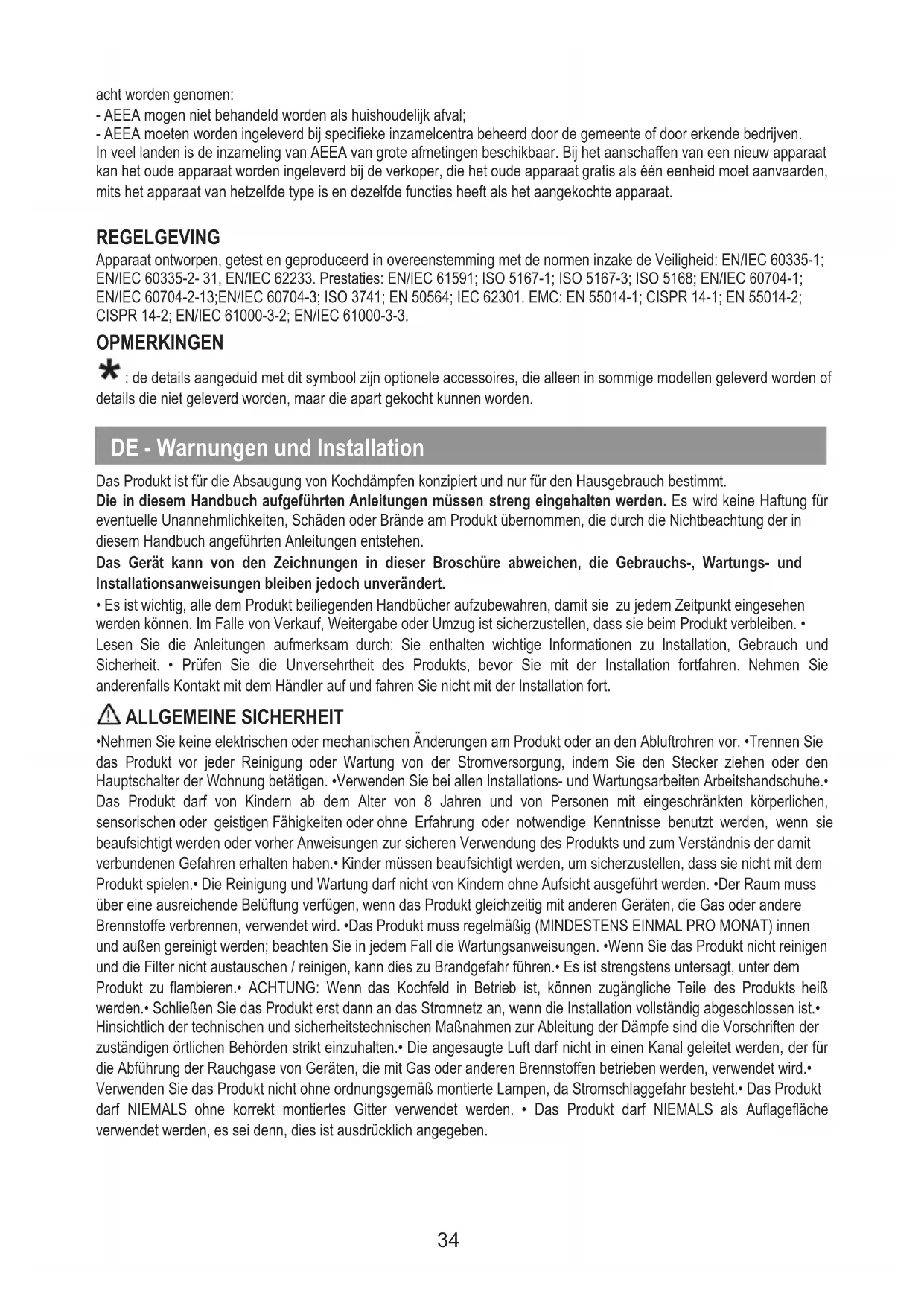 - Nehmen Sie keine elektrischen oder mechanischen Änderungen am Produkt oder an den Abluftrohren vor. •Trennen Sie das Produkt vor jeder Reinigung oder Wartung von der Stromversorgung, indem Sie den Stecker ziehen oder den Hauptschalter der Wohnung betätigen. •Verwenden Sie bei allen Installations- und Wartungsarbeiten Arbeitshandschuhe.• Das Produkt darf von Kindern ab dem Alter von 8 Jahren und von Personen mit eingeschränkten körperlichen, sensorischen oder geistigen Fähigkeiten oder ohne Erfahrung oder notwendige Kenntnisse benutzt werden, wenn sie beaufsichtigt werden oder vorher Anweisungen zur sicheren Verwendung des Produkts und zum Verständnis der damit verbundenen Gefahren erhalten haben.• Kinder müssen beaufsichtigt werden, um sicherzustellen, dass sie nicht mit dem Produkt spielen.• Die Reinigung und Wartung darf nicht von Kindern ohne Aufsicht ausgeführt werden. •Der Raum muss über eine ausreichende Belüftung verfügen, wenn das Produkt gleichzeitig mit anderen Geräten, die Gas oder andere Brennstoffe verbrennen, verwendet wird. •Das Produkt muss regelmäßig (MINDESTENS EINMAL PRO MONAT) innen und außen gereinigt werden; beachten Sie in jedem Fall die Wartungsanweisungen. •Wenn Sie das Produkt nicht reinigen und die Filter nicht austauschen / reinigen, kann dies zu Brandgefahr führen.• Es ist strengstens untersagt, unter dem Produkt zu flambieren.• ACHTUNG: Wenn das Kochfeld in Betrieb ist, können zugängliche Teile des Produkts heiß werden.• Schließen Sie das Produkt erst dann an das Stromnetz an, wenn die Installation vollständig abgeschlossen ist.• Hinsichtlich der technischen und sicherheitstechnischen Maßnahmen zur Ableitung der Dämpfe sind die Vorschriften der zuständigen örtlichen Behörden strikt einzuhalten.• Die angesaugte Luft darf nicht in einen Kanal geleitet werden, der für die Abführung der Rauchgase von Geräten, die mit Gas oder anderen Brennstoffen betrieben werden, verwendet wird.• Verwenden Sie das Produkt nicht ohne ordnungsgemäß montierte Lampen, da Stromschlaggefahr besteht.• Das Produkt darf NIEMALS ohne korrekt montiertes Gitter verwendet werden. • Das Produkt darf NIEMALS als Auflagefläche verwendet werden, es sei denn, dies ist ausdrücklich angegeben. 34• Verwenden Sie für den Austausch der Lampe nur den im Abschnitt Wartung/Beleuchtungssystem dieses Handbuchs angegebenen Lampentyp. • Der Einsatz der freien Flamme ist für die Filter schädlich und kann zu Bränden führen, es muss daher in jedem Fall vermieden werden. • Das Frittieren muss unter Kontrolle durchgeführt werden, um zu verhindern, dass sich überhitztes Öl entzündet. • Wenden Sie sich im Zweifelsfall an ein autorisiertes Kundendienstzentrum oder an ähnlich qualifiziertes Personal.
