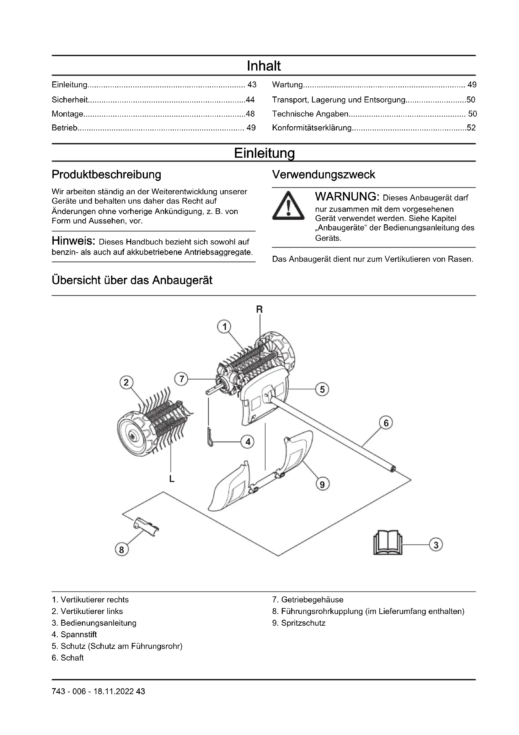 - Konformitätserklärung Einleitung Produktbeschreibung Wir arbeiten ständig an der Weiterentwicklung unserer Geräte und behalten uns daher das Recht auf Änderungen ohne vorherige Ankündigung, z.B. von Form und Aussehen, vor. Hinweis: Dieses Handbuch bezieht sich sowohl auf benzin- als auch auf akkubetriebene Antriebsaggregate. Verwendungszweck WARNUNG: Dieses Anbaugerät darf nur zusammen mit dem vorgesehenen Gerät verwendet werden. Siehe Kapitel „Anbaugeräte“ der Bedienungsanleitung des Geräts. Das Anbaugerät dient nur zum Vertikutieren von Rasen. Übersicht über das Anbaugerät p. 52