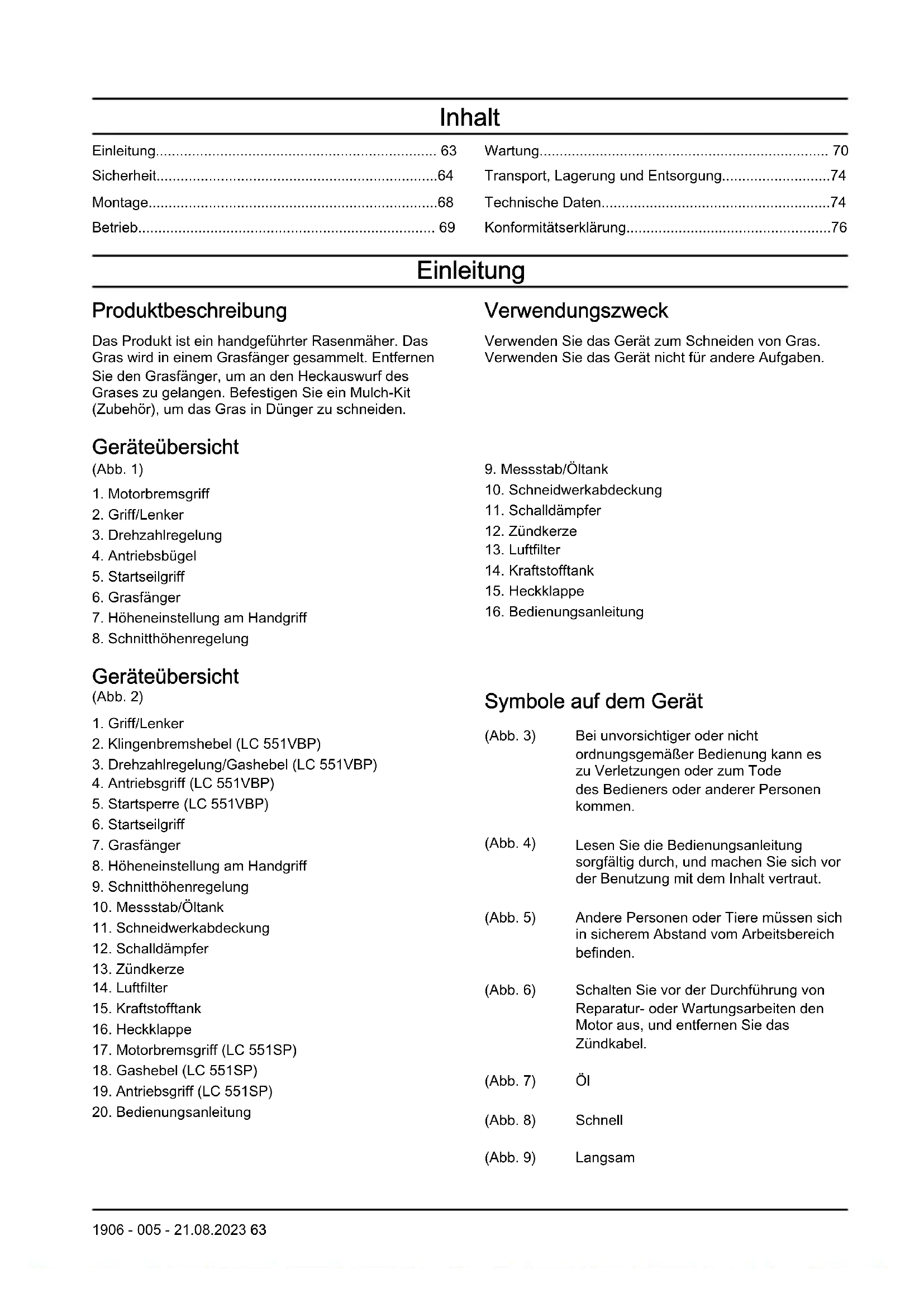 - Konformitätserklärung Einleitung Produktbeschreibung Das Produkt ist ein handgeführter Rasenmäher. Das Gras wird in einem Grasfänger gesammelt. Entfernen Sie den Grasfänger, um an den Heckauswurf des Grases zu gelangen. Befestigen Sie ein Mulch-Kit (Zubehör), um das Gras in Dünger zu schneiden. Verwendungszweck Verwenden Sie das Gerät zum Schneiden von Gras. Verwenden Sie das Gerät nicht für andere Aufgaben. Geräteübersicht (Abb. 1) p. 76