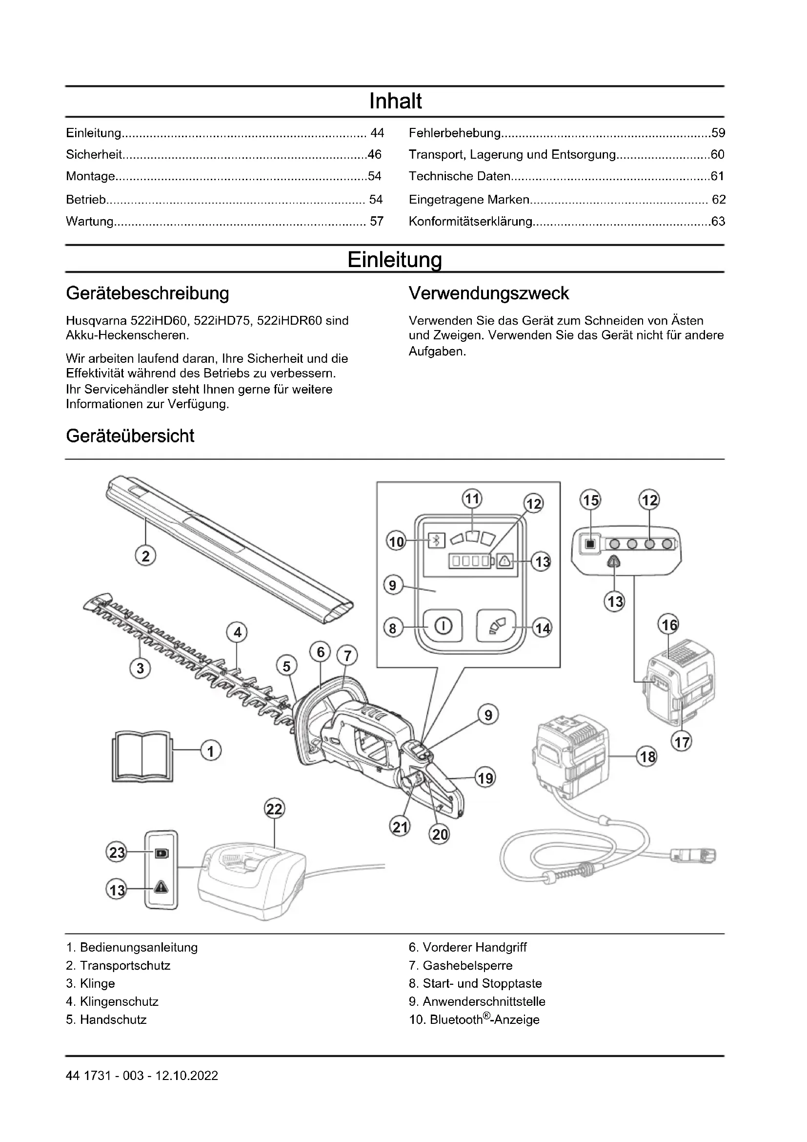 - Konformitätserklärung Einleitung Gerätebeschreibung Husqvarna 522iHD60, 522iHD75, 522iHDR60 sind Akku-Heckenscheren. Wir arbeiten laufend daran, Ihre Sicherheit und die Effektivität während des Betriebs zu verbessern. Ihr Servicehändler steht Ihnen gerne für weitere Informationen zur Verfügung. Verwendungszweck Verwenden Sie das Gerät zum Schneiden von Ästen und Zweigen. Verwenden Sie das Gerät nicht für andere Aufgaben. Geräteübersicht p. 63
