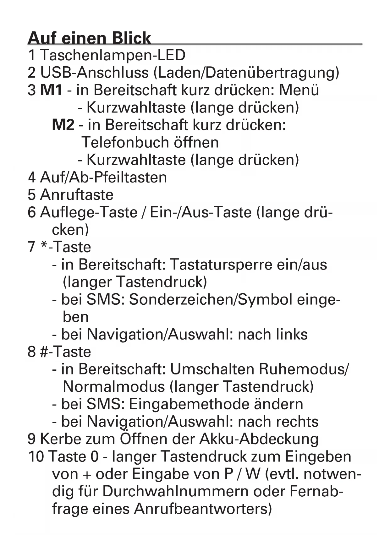 PowerTel M6350Auf einen Blick 1 Taschenlampen-LED 2 USB-Anschluss (Laden/Datenübertragung) 3 M1 - in Bereitschaft kurz drücken: Menü - Kurzwahltaste (lange drücken) M2 - in Bereitschaft kurz drücken: Telefonbuch öffnen - Kurzwahltaste (lange drücken) 4 Auf/Ab-Pfeiltasten 5 Anruftaste 6 Auflege-Taste / Ein-/Aus-Taste (lange drü- cken) 7 *-Taste - in Bereitschaft: Tastatursperre ein/aus (langer Tastendruck) - bei SMS: Sonderzeichen/Symbol einge- ben - bei Navigation/Auswahl: nach links 8 #-Taste - in Bereitschaft: Umschalten Ruhemodus/ Normalmodus (langer Tastendruck) - bei SMS: Eingabemethode ändern - bei Navigation/Auswahl: nach rechts 9 Kerbe zum Öffnen der Akku-Abdeckung 10 Taste 0 - langer Tastendruck zum Eingeben von + oder Eingabe von P / W (evtl. notwen- dig für Durchwahlnummern oder Fernab- frage eines Anrufbeantworters)11 Taschenlampen-Schalter 12 SOS-Taste Lieferumfang 1 Mobiltelefon 1 Akku 1 USB-Kabel 1 Tischladegerät 1 Bedienungsanleitung Installation SIM-Karte, Speicherkarte und Akku einsetzen 1 Akku-Abdeckung abnehmen. 2 Micro-SD-Kartenhalter zum Entriegeln nach rechts schieben und aufklappen. Micro-SD- Karte (nicht mitgeliefert) formschlüssig ein- legen (Kontakte nach unten), Kartenhalter herunterklappen und zum Verriegeln nach links schieben. 3 SIM-Karte mit den Kontakten nach unten unter die Halterung schieben. Abgeschrägte Ecke beachten! 4 Akku einsetzen (Kontakte nach unten rechts). 5 Akku-Abdeckung wieder auflegen und rundherum andrücken. 1Anrufen/Anruf annehmen Anrufen 1 Im Ruhezustand: Rufnummer incl. Vorwahl eingeben. 2 drücken. 3 Zum Beenden drücken. Anruf annehmen 1 drücken. Telefonbuch Kontakt im Telefonbuch erstellen 1 Im Ruhezustand: Menü (M1) drücken, Tele- fonbuch auswählen und OK drücken. 2 Neuen Kontakt hinzufügen auswählen und OK drücken. 3 Speicherort wählen und OK drücken. 4 Name und Rufnummer eingeben. 5 Option drücken, Speichern auswählen und Wählen drücken. 6 Mit zum Ruhezustand zurückkehren. Hinweis: Geben Sie immer ein + (langer Tas- tendruck auf „0“) vor der Länderkennzahl ein, um internationale Anrufe machen zu können. 2Aus dem Telefonbuch anrufen 1 Im Ruhezustand: Namen (M2) drücken. 2 Mit den Pfeiltasten Eintrag auswählen. 3 drücken. Mitteilungen SMS schreiben und senden 1 Im Ruhezustand: Menü (M1) drücken, Mit- teilungen auswählen und OK drücken. 2 Mitteilung schreiben auswählen und OK drücken. 3 Text eingeben. Mit der *-Taste Symbole einblenden und mit den Pfeiltasten oder *- und #-Taste Symbol auswählen und OK drücken. Mit der #-Taste Eingabemethode ändern. Für Umlaute (ä, ö, ü ....) Einstellung DE oder de wählen. 4 Option drücken, Senden an wählen, Ruf- nummer eingeben oder aus Telefonbuch oder Anrufliste wählen und OK drücken. 5 Option drücken, Senden wählen und Wäh- len drücken. SMS lesen 1 Im Ruhezustand: Menü (M1) drücken, Mit- teilungen auswählen und OK drücken. 32 Posteingang auswählen und OK drücken. 3 Mitteilung auswählen und mit Option -> An- sicht -> Wählen ansehen. Weitere Optionen: - Antworten: Mitteilung eingeben und an den Absender senden. - Sender anrufen: Den Absender anrufen. - Weiterleiten: Mitteilung an eine andere Rufnummer weiterleiten. - Löschen: Mitteilung löschen. - Selbe Nummer Löschen: Alle Mitteilun- gen von dieser Nummer löschen. - Alles löschen: Alle Mitteilungen löschen. - Im Telefonbuch speichern: Rufnummer im Telefonbuch speichern. Anrufliste 1 Im Ruhezustand: Menü (M1) drücken, An- rufliste auswählen und OK drücken. 2 Gewünschte Liste auswählen und OK drü- cken, um die Anrufe anzusehen (verpasst, gewählt, angenommen, alle) oder Anrufprotokolle löschen auswählen, um alle Listen zu löschen. 4Extras 1 Im Ruhezustand: Menü (M1) drücken, Ex- tras auswählen und OK drücken. 2 Zur Auswahl stehen: - Wecker: Sie können bis zu 5 verschiedene Weckzeiten eingeben. - Rechner: Geben Sie die erste Zahl ein (Dezimalkomma mit der #-Taste), wählen Sie das Rechenzeichen mit den Pfeiltas- ten und geben Sie die nächste Zahl ein. Zur Anzeige des Ergebnisses drücken Sie OK. - Kalender: Der heutige Tag ist markiert. Wählen Sie mit den Pfeiltasten und *- und #-Taste einen Tag aus (oder nutzen Sie „Zu Datum springen“) und geben Sie ein Ereignis ein, an das Sie erinnert wer- den wollen. - Bluetooth: Ein-/Ausschalten der Blue- tooth-Funktion und Suchfunktion zur Kopplung von Bluetooth-Geräten. - Datei-Manager: Verwalten von Dateien im Telefon/auf der Speicherkarte. - Speicherkarte-Werkzeug: Umfang und Angebot abhängig von der verwendeten SIM-Karte (Provider/Netzbetreiber). 5Multimedia 1 Im Ruhezustand: Menü (M1) drücken, Multi- media auswählen und OK drücken. 2 Zur Auswahl stehen: - FM UKW (Radio): Mit Option können Sie z. B. einen Sender-Suchlauf starten, Sen- derfrequenzen manuell eingeben etc. Lautstärkeeinstellung mit *- bzw. #-Taste. - Bilddateien: Zum Ansehen von auf dem Telefon gespeicherten Bilddateien. Einstellungen 1 Im Ruhezustand: Menü (M1) drücken, Ein- stellungen auswählen und OK drücken. 2 Zur Auswahl stehen: - SOS Einstel.: Einstellungen für die Notruf- Funktion (Ein/Aus / Notrufnummern ein- geben / Einstellungen für Notruf-SMS / Einstellung für Warnton). - Anrufeinstellungen: Einstellungen für die Anruf-ID (Rufnummernübertragung), An- klopfen, Rufumleitungen, Anrufsperre, Ausschlussliste, Auto-Wahlwiederholung, Anrufzeitanzeige, Anrufzeiterinnerung (Signal), Annahmemodus. - Telefoneinstellungen: Einstellungen für Uhrzeit und Datum, Sprache, Bevorzugte Eingabemethode, Anzeige (Display).