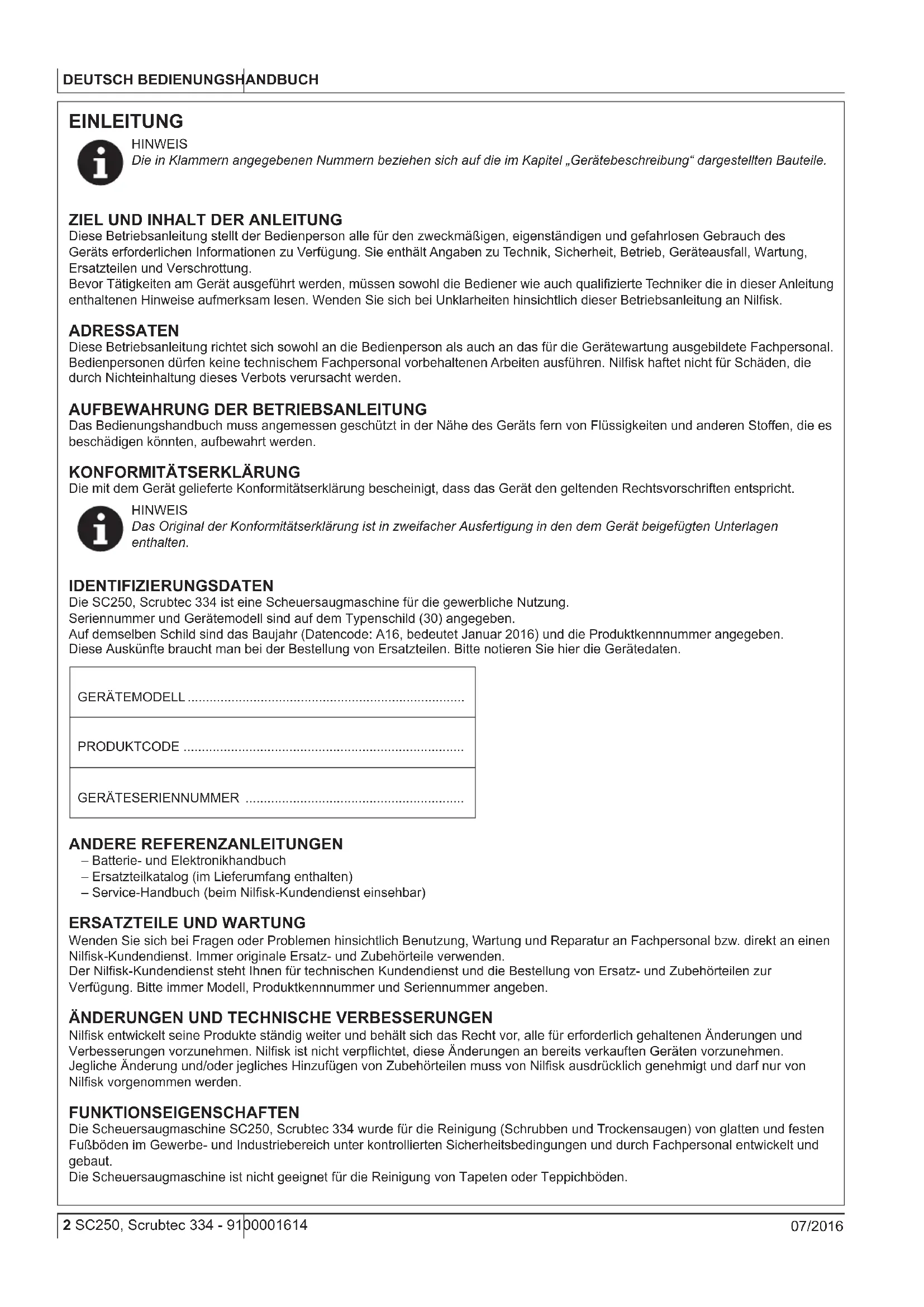 Die mit dem Gerät gelieferte Konformitätserklärung bescheinigt, dass das Gerät den geltenden Rechtsvorschriften entspricht. HINWEIS Das Original der Konformitätserklärung ist in zweifacher Ausfertigung in den dem Gerät beigefügten Unterlagen enthalten. IDENTIFIZIERUNGSDATEN Die SC250, Scrubtec 334 ist eine Scheuersaugmaschine für die gewerbliche Nutzung. Seriennummer und Gerätemodell sind auf dem Typenschild (30) angegeben. Auf demselben Schild sind das Baujahr (Datencode: A16, bedeutet Januar 2016) und die Produktkennnummer angegeben. Diese Auskünfte braucht man bei der Bestellung von Ersatzteilen. Bitte notieren Sie hier die Gerätedaten. GERÄTEMODELL ............................................................................ PRODUKTCODE ............................................................................. GERÄTESERIENNUMMER ............................................................ ANDERE REFERENZANLEITUNGEN – Batterie- und Elektronikhandbuch – Ersatzteilkatalog (im Lieferumfang enthalten) – Service-Handbuch (beim Nilsk-Kundendienst einsehbar)