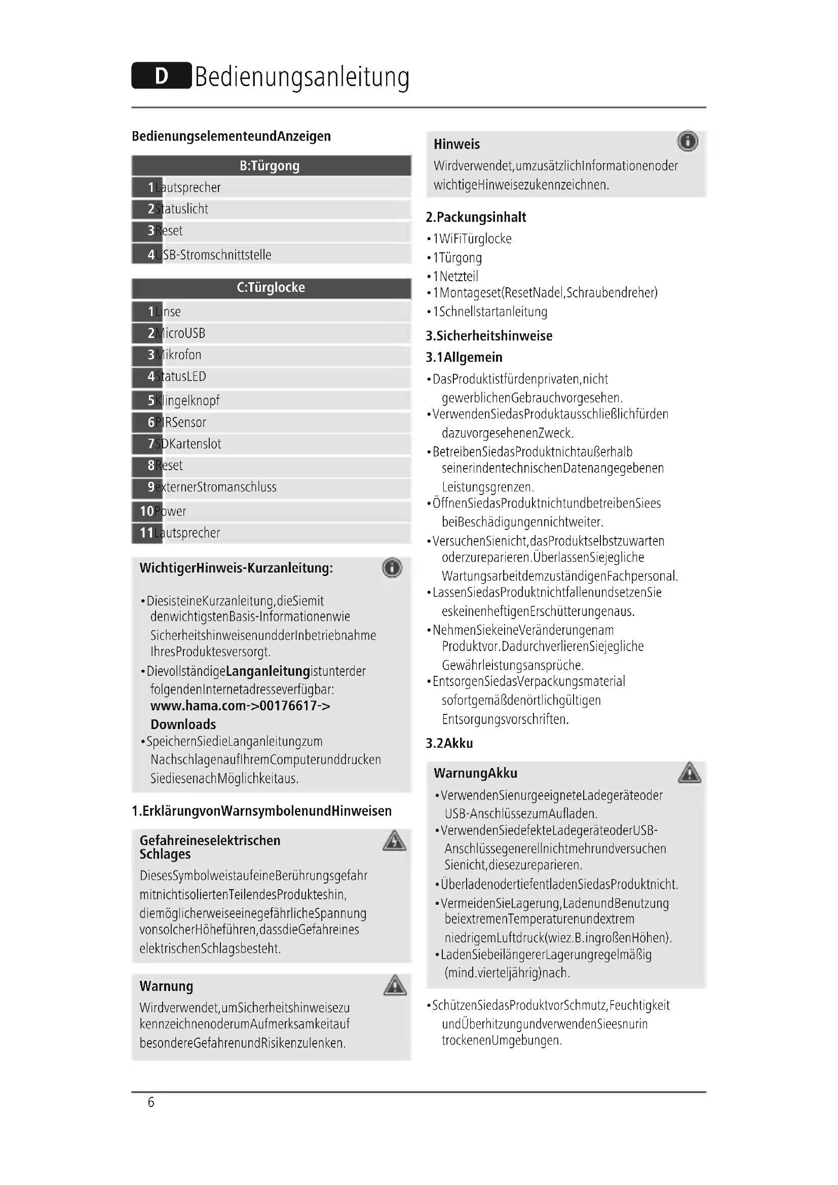 Laden Sie die Anleitung für Ihr Türklingeln kostenlos im PDF-Format! Finden Sie Ihr Handbuch 176617 - HAMA und nehmen Sie Ihr elektronisches Gerät wieder in die Hand. Auf dieser Seite sind alle Dokumente veröffentlicht, die für die Verwendung Ihres Geräts notwendig sind. 176617 von der Marke HAMA.