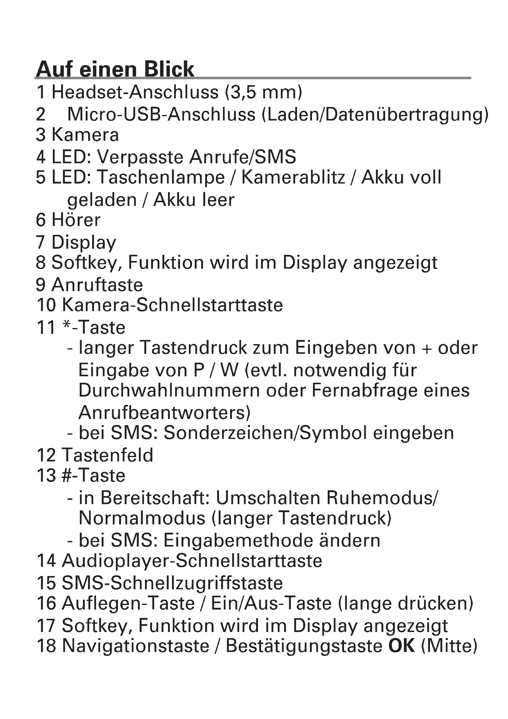 Micro-USB-Anschluss (Laden/Datenübertragung) 3 Kamera 4 LED: Verpasste Anrufe/SMS 5 LED: Taschenlampe / Kamerablitz / Akku voll geladen / Akku leer 6 Hörer 7 Display 8 Softkey, Funktion wird im Display angezeigt 9 Anruftaste 10 Kamera-Schnellstarttaste 11 *-Taste - langer Tastendruck zum Eingeben von + oder Eingabe von P / W (evtl. notwendig für Durchwahlnummern oder Fernabfrage eines Anrufbeantworters) - bei SMS: Sonderzeichen/Symbol eingeben 12 Tastenfeld 13 #-Taste - in Bereitschaft: Umschalten Ruhemodus/ Normalmodus (langer Tastendruck) - bei SMS: Eingabemethode ändern 14 Audioplayer-Schnellstarttaste 15 SMS-Schnellzugriffstaste 16 Auflegen-Taste / Ein/Aus-Taste (lange drücken) 17 Softkey, Funktion wird im Display angezeigt 18 Navigationstaste / Bestätigungstaste OK (Mitte)19 Verstärkertaste (kurz drücken) / Taschenlampe (lang drücken) 20 Lautstärkeeinstellung 21 SOS-Taste 22 Lautsprecher Lieferumfang 1 Mobiltelefon 1 Akku 1 USB-Kabel 1 Tischladegerät 1 Bedienungsanleitung Installation SIM-Karte, Speicherkarte und Akku einsetzen Zur Speicherung von Fotos, Videos etc. sollten Sie eine microSD-Karte einsetzen. Ist die microSD- Karte nicht FAT-formatiert, können Sie sie beim Einlegen formatieren. 1 Akku-Abdeckung abnehmen. 2 Micro-SD-Karte mit den Kon- takten nach unten in den Steckplatz einführen. 3 SIM-Karte mit den Kontakten nach unten unter die Halte- rung schieben. Abgeschrägte Ecke beachten! 4 Akku einsetzen (Kontakte nach unten rechts).