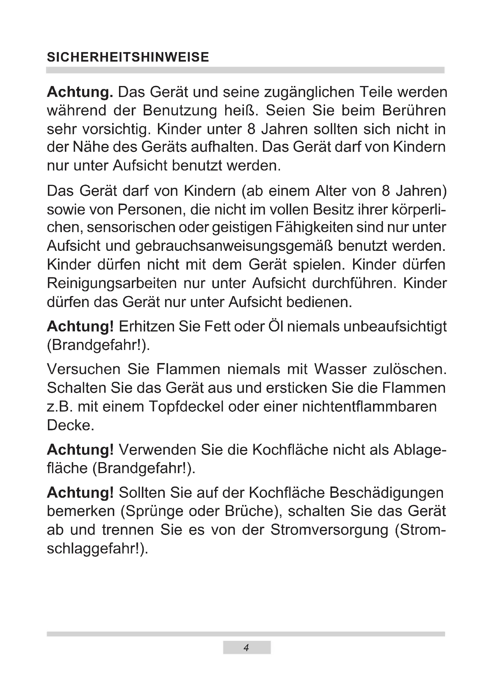 - Technische Daten SICHERHEITSHINWEISE Achtung. Das Gerät und seine zugänglichen Teile werden während der Benutzung heiß. Seien Sie beim Berühren sehr vorsichtig. Kinder unter 8 Jahren sollten sich nicht in der Nähe des Geräts aufhalten. Das Gerät darf von Kindern nur unter Aufsicht benutzt werden. Das Gerät darf von Kindern (ab einem Alter von 8 Jahren) sowie von Personen, die nicht im vollen Besitz ihrer körperli- chen, sensorischen oder geistigen Fähigkeiten sind nur unter Aufsicht und gebrauchsanweisungsgemäß benutzt werden. Kinder dürfen nicht mit dem Gerät spielen. Kinder dürfen Reinigungsarbeiten nur unter Aufsicht durchführen. Kinder dürfen das Gerät nur unter Aufsicht bedienen. Achtung! Erhitzen Sie Fett oder Öl niemals unbeaufsichtigt (Brandgefahr!). Versuchen Sie Flammen niemals mit Wasser zulöschen. Schalten Sie das Gerät aus und ersticken Sie die Flammen z.B. mit einem Topfdeckel oder einer nichtentammbaren Decke. Achtung! Verwenden Sie die Kochäche nicht als Ablage- äche (Brandgefahr!). Achtung! Sollten Sie auf der Kochäche Beschädigungen bemerken (Sprünge oder Brüche), schalten Sie das Gerät ab und trennen Sie es von der Stromversorgung (Strom- schlaggefahr!).5 SICHERHEITSHINWEISE Starke Erhitzung des Geräts während des Betriebs. Seien Sie vorsichtig und vermeiden Sie das Berühren der heißen Innenteile des Geräts. Zugängliche Teile können bei Be nut zung heiß werden. Kin- der fern halten. Achtung. Verwenden Sie zur Reinigung der Kochäche keine aggressiven Putzmittel oder scharfen Metallgegen- stände, die die Oberäche beschädigen könnten (Entstehung von Sprüngen oder Brüchen). Achtung.Um Stromschläge zu vermeiden, muss man sich vor dem Wechsel die Glühlampe vergewissern, dass das Gerät abgeschaltet ist. Zur Reinigung des Geräts keine Dampfreiniger verwen- den. Verbrühungsgefahr! Heißer Dampf kann beim Önen der Gerätetür entweichen. Während oder nach dem Garbetrieb die Gerätetür vorsichtig önen. Beim Önen nicht über die Gerätetür beugen. Beachten Sie, dass Dampf je nach Tem- peratur nicht sichtbar ist.6 SICHERHEITSHINWEISE ● Andere Haushaltsgeräte samt ihren Anschlusskabeln dürfen den Backofen nicht berühren oder auf den Kochächen auiegen, da deren Isolierung nicht hitzebe- ständig ist. ● Beim Braten den Herd nicht ohne Aufsicht lassen! Öl und Fett können sich durch Überhitzen oder Überlaufen selbst entzünden. ● Kochplatte von Verschmutzungen und übergelaufenem Kochgut freihalten. Dies betrit insbesondere Zucker, der mit dem Glaskeramik-Kochfeld reagiert und da- durch eine bleibende Beschädigung verursachen kann. Etwaige Verschmutzungen sind laufend zu beseitigen. ● Zur Vermeidung von irreversiblen Veränderungen des Kochfelds darf Geschirr mit feuchtem Boden nicht auf warme Kochächen gestellt werden. ● Nur Kochgeschirr verwenden, das nach Herstelleragaben für die Verwendung auf Glaskeramik-Kochfeldern geeignet ist. ● Bei Feststellung einer Beschädigung des Kochfelds – Kratzern, Rissen oder Ab- splitterungen – ist der Betrieb des Herdes sofort abzubrechen und die Reparatur bei der Kundendienststelle zu melden. ● Das Kochfeld nicht einschalten, ohne vorher ein Kochgeschirr darauf zu stellen. ● Scharfkantiges Geschirr, das eine Beschädigung des Kochfelds verursachen kann, darf nicht benutzt werden. ● Nicht auf die sich vorheizenden (nicht mit Geschirr überdeckten) Halogen-Koch- ächen schauen. ● Kochgeschirr mit einem Gewicht über 15 kg darf nicht auf die geönete Backofen- tür und Kochgeschirr mit einem Gewicht über 25 kg auf die Kochächen gestellt werden. ● Keine Scheuermittel oder scharfen Metallgegenstände zur Glasreinigung verwen- den; sie können die Oberäche zerkratzen, was dazu führen kann, dass das Glas springt. ● In nicht betriebsfähigem Zustand darf der Herd nicht benutzt werden. Sämtliche Mängel dürfen nur von einer autorisierten Fachkraft beseitigt werden. ● Bei Betriebsstörungen, die durch technische Mängel verursacht sind, muss unbe- dingt die Stromzufuhr unterbrochen und eine Reparatur veranlasst werden. ● Dieses Gerät ist nicht für eine Bedienung durch Personen mit eingeschränkten physischen, psychischen bzw. sensorischen Fähigkeiten (darunter Kinder) bzw. Personen ohne Kenntnis des Gerätes vorgesehen, es sei denn, dies erfolgt unter Aufsicht oder gemäß der Bedienungsanleitung des Gerätes, die durch die für die Sicherheit verantwortliche Person übergeben wurde. ● Es ist dafür zu sorgen, dass Kinder nicht mit dem Gerät spielen. ● Das Gerät ist ausschließlich zum Kochen im haushaltsüblichen Rahmen ausgelegt. Ein anderweitiger Gebrauch jeder Art (z.B. zur Raumbeheizung) ist nicht bestim- mungsgemäß und kann gefährlich sein.7 UNSERE ENERGIESPARTIPPS Wer Energie verantwort- lich verbraucht, der schont nicht nur die Haushaltskas- se, sondern handelt auch umweltbewusst. Seien Sie dabei! Sparen Sie Elektro- energie! Folgendes können Sie tun: ● Das richtige Kochgeschirr benutzen. Töpfe mit achem und dickem Boden sparen bis zu 1/3 an Strom. Deckel nicht vergessen, sonst ist der Stromverbrauch 4-mal so hoch! ● Kochgeschirr auf die Kochäche ab- stimmen. Das Kochgeschirr sollte nie kleiner als die Kochäche sein. ● Kochächen und Topfböden stets sau- ber halten. Verschmutzungen stören die Wärmeübertra- gung – sind sie erst einmal stark eingebrannt, ist die Reinigung oft nur noch mit umweltbe- lastenden Mitteln möglich. ● Unnötiges „Topfgucken” vermeiden. Auch die Backofentür nicht unnötig oft önen. Rechtzeitig herunterschalten und Rest- wärme nutzen. Bei langen Garzeiten 5-10 Minuten vor Ende der Garzeit ausschalten. Sie sparen bis zu 20% an Strom. ● Backofen nur bei größeren Mengen einsetzen. Fleisch mit einem Gewicht bis zu 1 kg lässt sich sparsamer im Topf auf dem Herd garen. ● Nachwärme des Backofens nutzen. Bei Garzeiten von mehr als 40 Minuten den Backofen unbedingt 10 Minuten vor dem Ende 