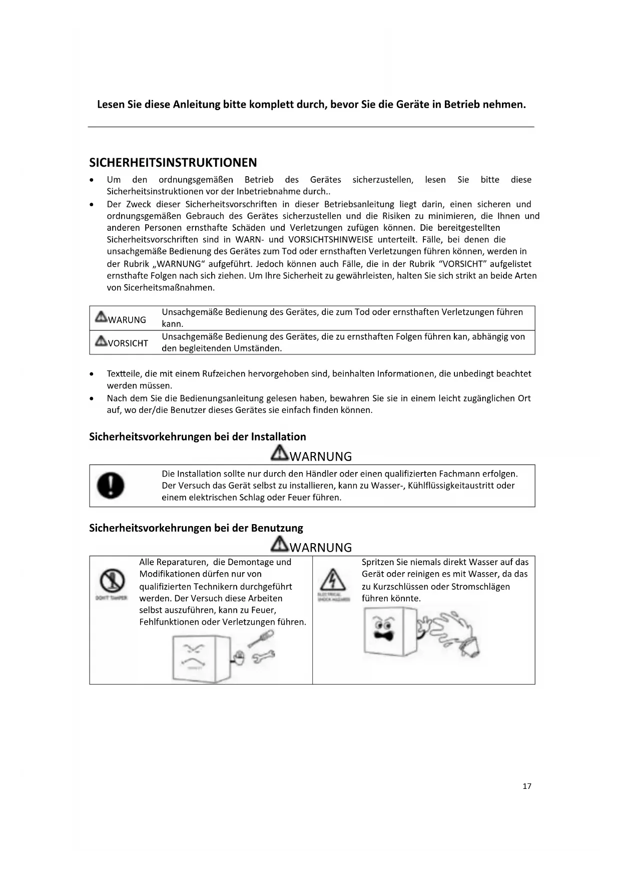 Alle Reparaturen, die Demontage und Modifikationen dürfen nur von qualifizierten Technikern durchgeführt werden. Der Versuch diese Arbeiten selbst auszuführen, kann zu Feuer, Fehlfunktionen oder Verletzungen führen.