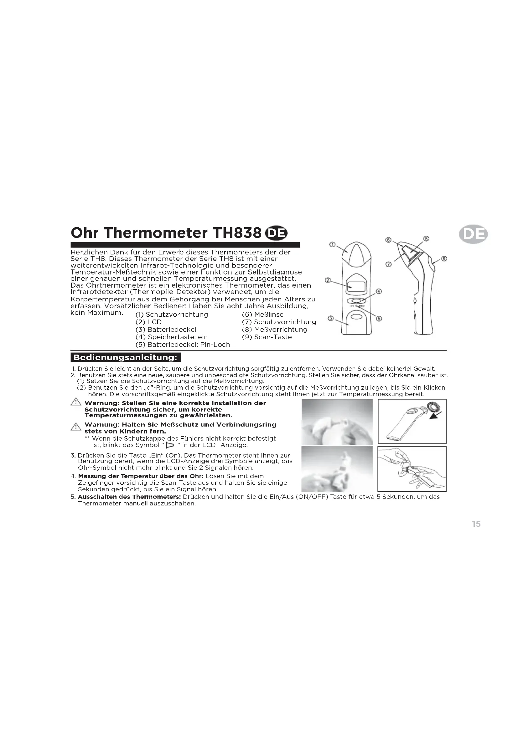 Ohr Thermometer TH838 Herzlichen Dank für den Erwerb dieses Thermometers der der Serie TH8. Dieses Thermometer der Serie TH8 ist mit einer weiterentwickelten Infrarot-Technologie und besonderer Temperatur-Meßtechnik sowie einer Funktion zur Selbstdiagnose einer genauen und schnellen Temperaturmessung ausgestattet.Das Ohrthermometer ist ein elektronisches Thermometer, das einen Infrarotdetektor (Thermopile-Detektor) verwendet, um die Körpertemperatur aus dem Gehörgang bei Menschen jeden Alters zu erfassen. Vorsätzlicher Bediener: Haben Sie acht Jahre Ausbildung, kein Maximum.(1) Schutzvorrichtung(2) LCD(3) Batteriedeckel(4) Speichertaste: ein(5) Batteriedeckel: Pin-Loch(6) Meßlinse(7) Schutzvorrichtung(8) Meßvorrichtung(9) Scan-Taste 1. Drücken Sie leicht an der Seite, um die Schutzvorrichtung sorgfältig zu entfernen. Verwenden Sie dabei keinerlei Gewalt. 2. Benutzen Sie stets eine neue, saubere und unbeschädigte Schutzvorrichtung. Stellen Sie sicher, dass der Ohrkanal sauber ist. (1) Setzen Sie die Schutzvorrichtung auf die Meßvorrichtung. (2) Benutzen Sie den „o"-Ring, um die Schutzvorrichtung vorsichtig auf die Meßvorrichtung zu legen, bis Sie ein Klicken hören. Die vorschriftsgemäß eingeklickte Schutzvorrichtung steht Ihnen jetzt zur Temperaturmessung bereit.Warnung: Stellen Sie eine korrekte Installation der Schutzvorrichtung sicher, um korrekte Temperaturmessungen zu gewährleisten.Warnung: Halten Sie Meßschutz und Verbindungsring stets von Kindern fern.** Wenn die Schutzkappe des Fühlers nicht korrekt befestigt ist, blinkt das Symbol " " in der LCD- Anzeige.3. Drücken Sie die Taste „Ein" (On). Das Thermometer steht Ihnen zur Benutzung bereit, wenn die LCD-Anzeige drei Symbole anzeigt, das Ohr-Symbol nicht mehr blinkt und Sie 2 Signalen hören.