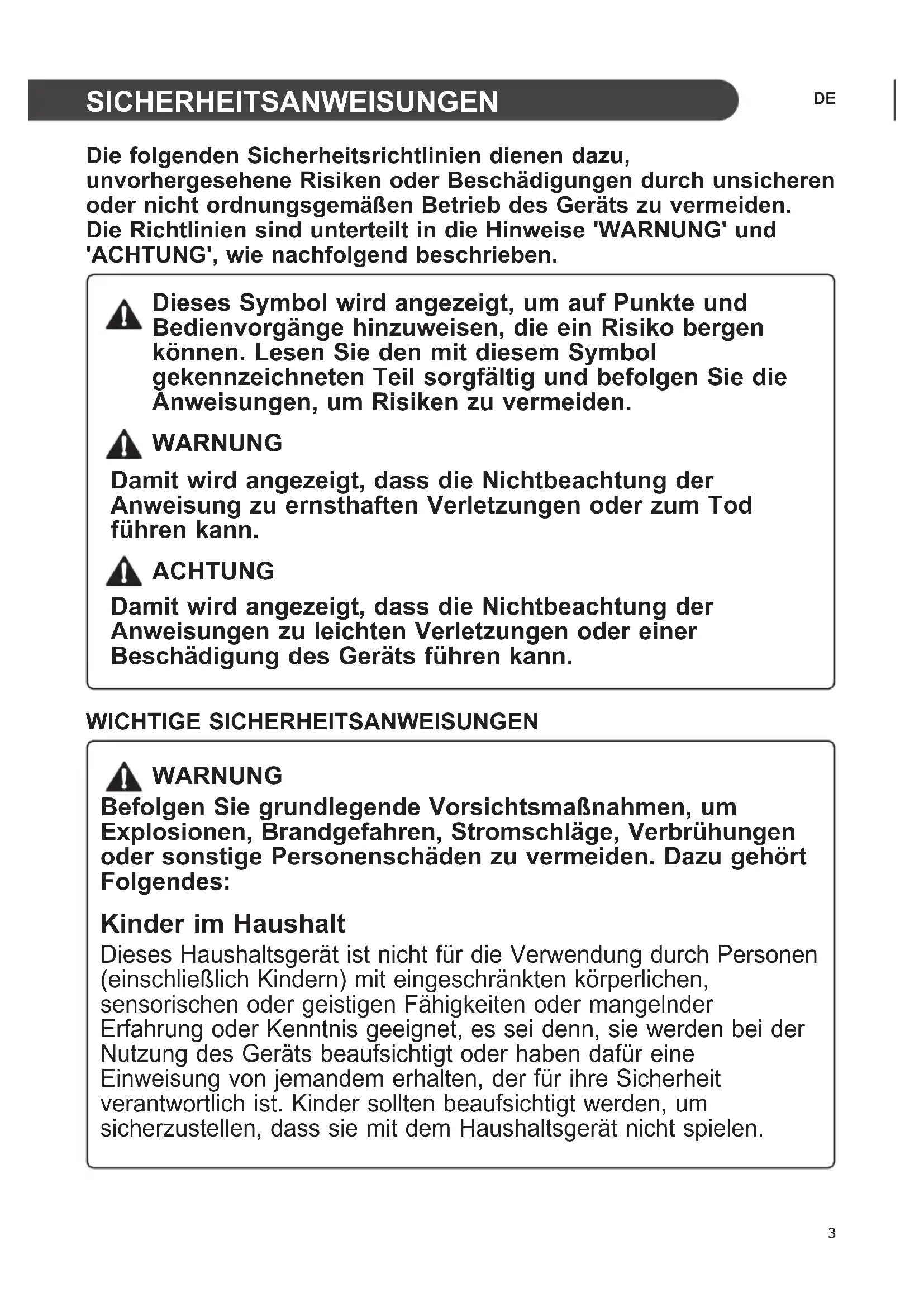 Die folgenden Sicherheitsrichtlinien dienen dazu, unvorhergesehene Risiken oder Beschädigungen durch unsicheren oder nicht ordnungsgemäßen Betrieb des Geräts zu vermeiden. Die Richtlinien sind unterteilt in die Hinweise 'WARNUNG' und 'ACHTUNG', wie nachfolgend beschrieben. Dieses Symbol wird angezeigt, um auf Punkte und Bedienvorgänge hinzuweisen, die ein Risiko bergen können. Lesen Sie den mit diesem Symbol gekennzeichneten Teil sorgfältig und befolgen Sie die Anweisungen, um Risiken zu vermeiden. WARNUNG Damit wird angezeigt, dass die Nichtbeachtung der Anweisung zu ernsthaften Verletzungen oder zum Tod führen kann. ACHTUNG Damit wird angezeigt, dass die Nichtbeachtung der Anweisungen zu leichten Verletzungen oder einer Beschädigung des Geräts führen kann. WICHTIGE SICHERHEITSANWEISUNGEN WARNUNG Befolgen Sie grundlegende Vorsichtsmaßnahmen, um Explosionen, Brandgefahren, Stromschläge, Verbrühungen oder sonstige Personenschäden zu vermeiden. Dazu gehört Folgendes: Kinder im Haushalt Dieses Haushaltsgerät ist nicht für die Verwendung durch Personen (einschließlich Kindern) mit eingeschränkten körperlichen, sensorischen oder geistigen Fähigkeiten oder mangelnder Erfahrung oder Kenntnis geeignet, es sei denn, sie werden bei der Nutzung des Geräts beaufsichtigt oder haben dafür eine Einweisung von jemandem erhalten, der für ihre Sicherheit verantwortlich ist. Kinder sollten beaufsichtigt werden, um sicherzustellen, dass sie mit dem Haushaltsgerät nicht spielen.4