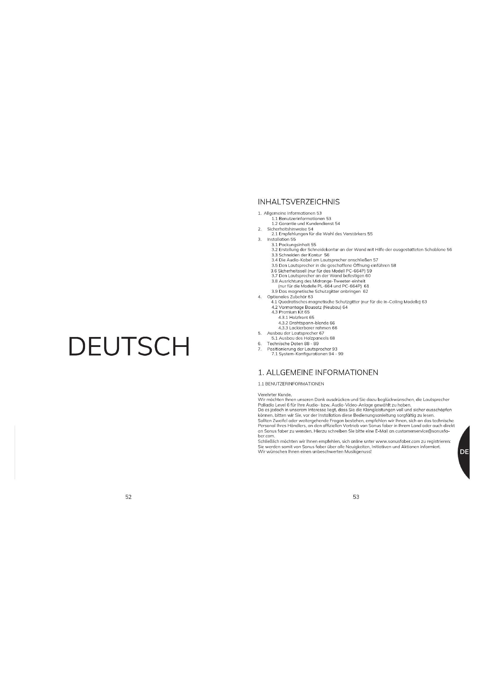 Verehrter Kunde, Wir möchten Ihnen unseren Dank ausdrücken und Sie dazu beglückwünschen, die Lautsprecher Palladio Level 6 für Ihre Audio- bzw. Audio-Video-Anlage gewählt zu haben. Da es jedoch in unserem Interesse liegt, dass Sie die Klangleistungen voll und sicher ausschöpfen können, bitten wir Sie, vor der Installation diese Bedienungsanleitung sorgfältig zu lesen. Sollten Zweifel oder weitergehende Fragen bestehen, empfehlen wir Ihnen, sich an das technische Personal Ihres Händlers, an den ofziellen Vertrieb von Sonus faber in Ihrem Land oder auch direkt an Sonus faber zu wenden. Hierzu schreiben Sie bitte eine E-Mail an customerservice@sonusfa- ber.com. Schließlich möchten wir Ihnen empfehlen, sich online unter www.sonusfaber.com zu registrieren: Sie werden somit von Sonus faber über alle Neuigkeiten, Initiativen und Aktionen informiert. Wir wünschen Ihnen einen unbeschwerten Musikgenuss!