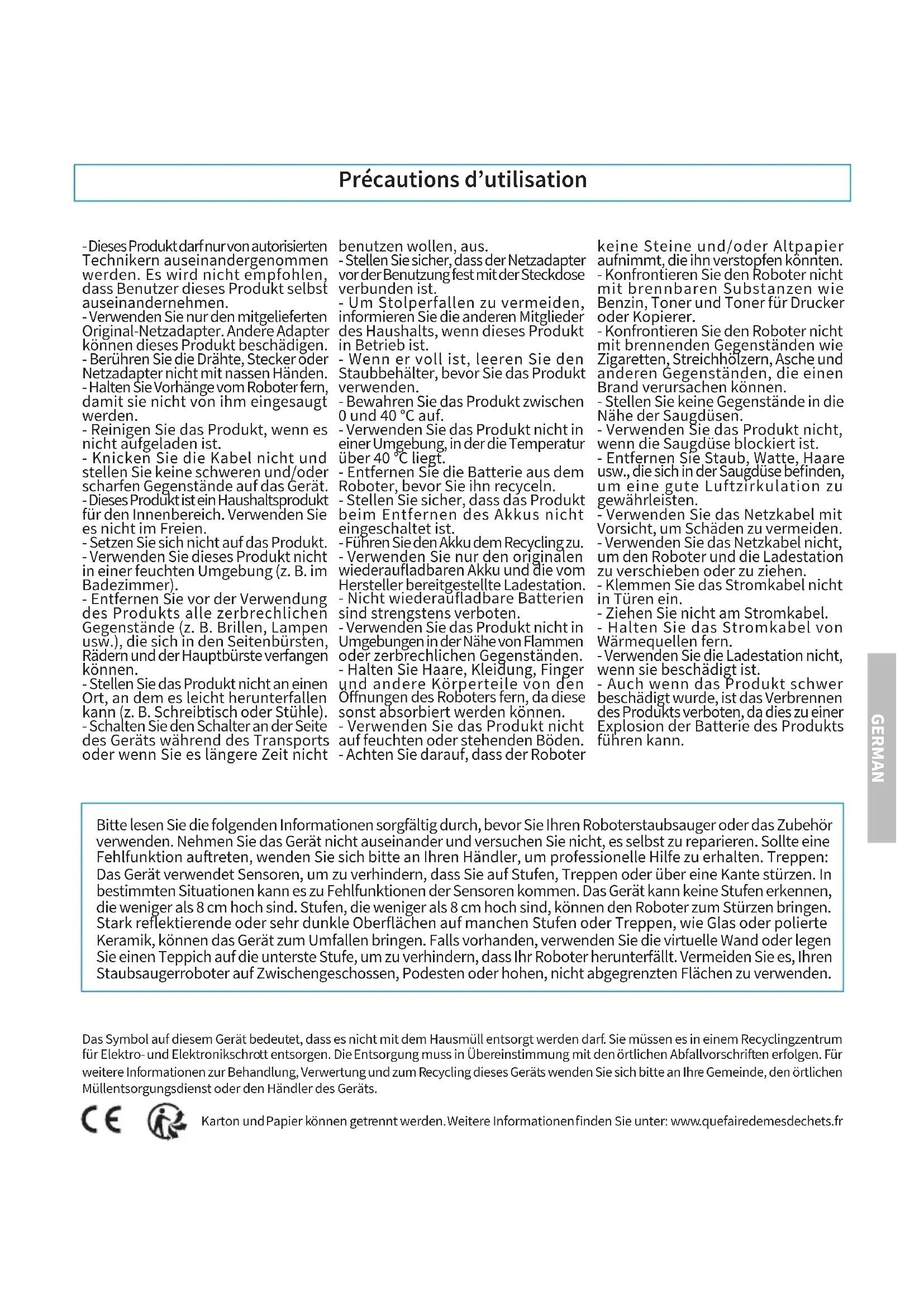 GERMANReinigung starten Die verschiedenen Reinigungsarten : Auto-Modus Der Roboter führt die vorgesehene Reinigung durch, indem er sich automatisch an seine Umgebung anpasst. - Schalten Sie den Hauptschalter ein. Wenn die LED leuchtet, ist der Roboter eingeschaltet. - Drücken Sie dann kurz die Taste am Roboter, auf der Fernbedienung oder aus der App heraus. Fokus-Modus Angepasst an den Boden, auf dem der Schmutz konzentriert ist, reinigt der Roboter den Boden «spiralförmig» und intensiv. - Drücken Sie kurz auf die Taste des Roboters, auf die Taste der Fernbedienung oder aus der App heraus. Rand-Modus Beim Reinigen von Sockelleisten reinigt der Roboter entlang der Wände. - Drücken Sie kurz auf die Taste des Roboters, auf die Taste der Fernbedienung oder aus der App heraus. Manuelle Steuerung Steuern Sie den Roboter manuell mithilfe der Richtungspfeile. - Drücken Sie die Richtungspfeile auf der Fernbedienung oder in der App. Kontrolle der Saugkraft Stellen Sie die Saugkraft entsprechend der verschiedenen Bodenarten ein. - Drücken Sie die Tasten auf der Fernbedienung oder aus der App heraus. Achtung: Die Saugkraft kann nur im Auto-Modus eingestellt werden. Kontrolle des Wasserflusses Stellen Sie die Wassermenge ein. - Drücken Sie die Taste auf der Fernbedienung oder aus der App heraus. Achtung: Der Wasserdurchuss kann nur gesteuert werden, wenn der Mopp auf dem Roboter installiert ist. Reinigung stoppen Wachsamkeit Drücken Sie während des Betriebs des Geräts die Taste «Start/Pause» am Roboter oder die Pausentaste auf der Fernbedienung oder in der App, um den Reinigungsvorgang zu unterbrechen. Start Der Roboter wechselt nach 10 Minuten Inaktivität in den Standby-Modus und alle Anzeigen erlöschen. Verwenden Sie eine beliebige Taste am Roboter oder in der Anwendung, um den Roboter wieder in Betrieb zu nehmen. Ausschalten Sobald das Gerät nicht mehr funktioniert, drücken Sie den Startknopf für einige Sekunden und alle Anzeigen erlöschen. Wenn Sie Ihren Roboter für längere Zeit nicht mehr benutzen möchten, stellen Sie den Schalter auf «O». Wenn Sie ihn regelmäßig verwenden möchten, lassen Sie den Schalter auf «I» stehen, damit er sich richtig auaden kann. GERMANPflege Ihres Geräts Um den Staubbehälter zu reinigen, befolgen Sie die folgenden Anweisungen: