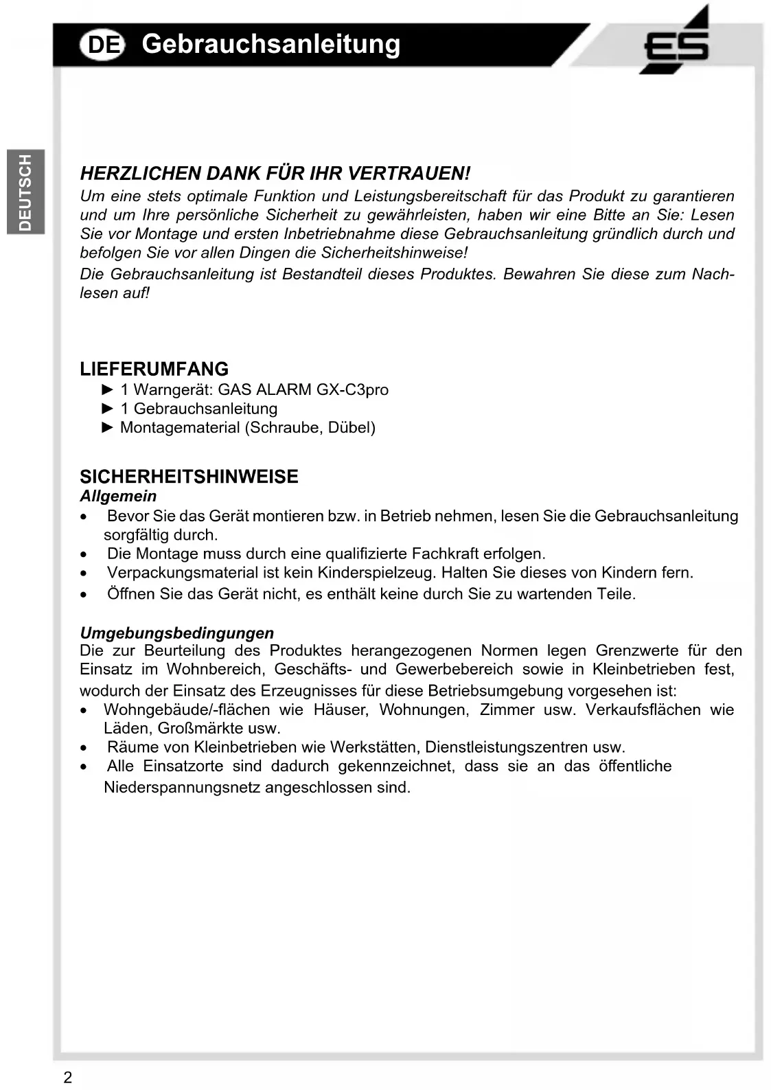 - Alle Einsatzorte sind dadurch gekennzeichnet, dass sie an das öentliche Niederspannungsnetz angeschlossen sind. LIEFERUMFANG ► 1 Warngerät: GAS ALARM GX-C3pro ► 1 Gebrauchsanleitung ► Montagematerial (Schraube, Dübel) Gebrauchsanleitung DE3