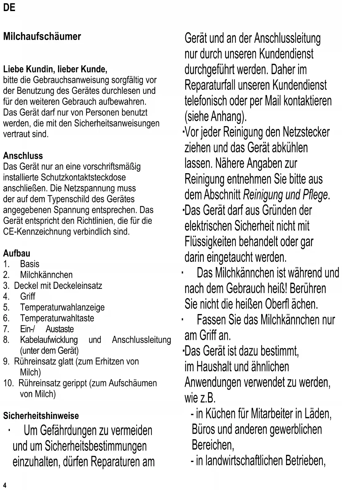 Milchaufschäumer Liebe Kundin, lieber Kunde, bitte die Gebrauchsanweisung sorgfältig vor der Benutzung des Gerätes durchlesen und für den weiteren Gebrauch aufbewahren. Das Gerät darf nur von Personen benutzt werden, die mit den Sicherheitsanweisungen vertraut sind. Anschluss Das Gerät nur an eine vorschriftsmäßig installierte Schutzkontaktsteckdose anschließen. Die Netzspannung muss der auf dem Typenschild des Gerätes angegebenen Spannung entsprechen. Das Gerät entspricht den Richtlinien, die für die CE-Kennzeichnung verbindlich sind. Aufbau