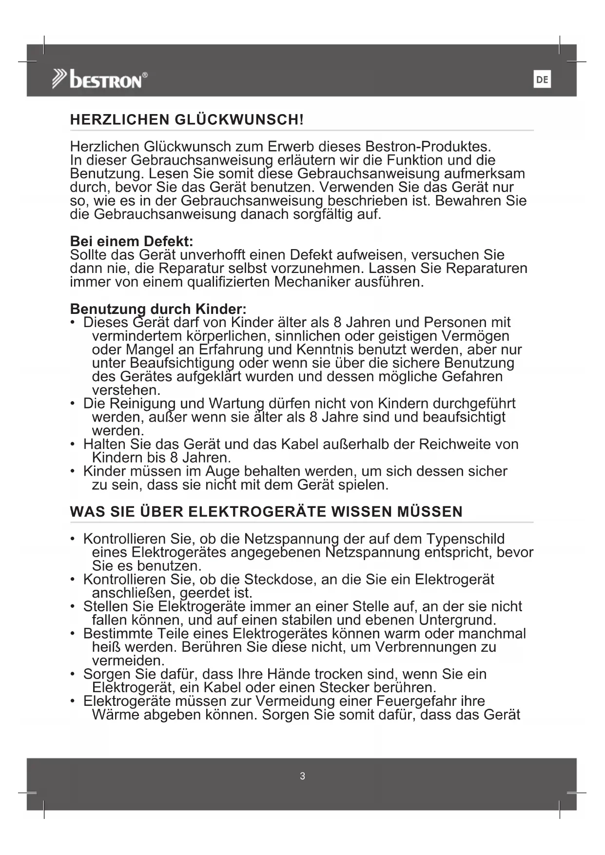 HERZLICHEN GLÜCKWUNSCH! Herzlichen Glückwunsch zum Erwerb dieses Bestron-Produktes. In dieser Gebrauchsanweisung erläutern wir die Funktion und die Benutzung. Lesen Sie somit diese Gebrauchsanweisung aufmerksam durch, bevor Sie das Gerät benutzen. Verwenden Sie das Gerät nur so, wie es in der Gebrauchsanweisung beschrieben ist. Bewahren Sie die Gebrauchsanweisung danach sorgfältig auf. Bei einem Defekt: Sollte das Gerät unverhofft einen Defekt aufweisen, versuchen Sie dann nie, die Reparatur selbst vorzunehmen. Lassen Sie Reparaturen immer von einem qualifizierten Mechaniker ausführen. Benutzung durch Kinder: