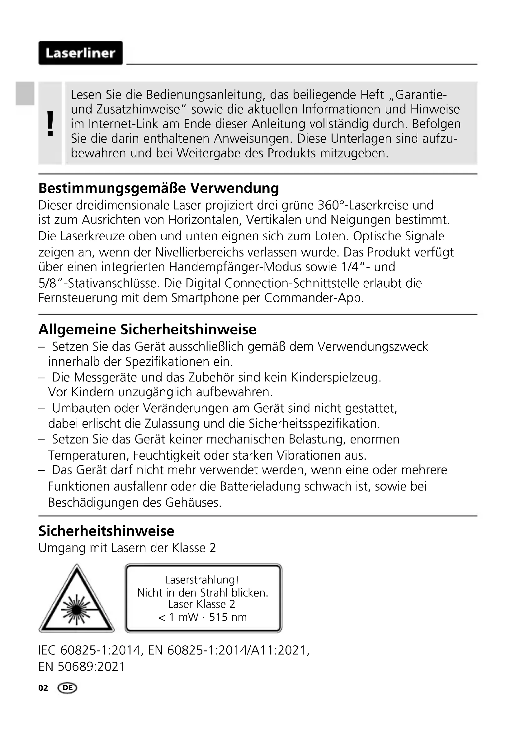 Bestimmungsgemäße Verwendung Dieser dreidimensionale Laser projiziert drei grüne 360°-Laserkreise und ist zum Ausrichten von Horizontalen, Vertikalen und Neigungen bestimmt. Die Laserkreuze oben und unten eignen sich zum Loten. Optische Signale zeigen an, wenn der Nivellierbereichs verlassen wurde. Das Produkt verfügt über einen integrierten Handempfänger-Modus sowie 1/4“- und 5/8“-Stativanschlüsse. Die Digital Connection-Schnittstelle erlaubt die Fernsteuerung mit dem Smartphone per Commander-App. Allgemeine Sicherheitshinweise – Setzen Sie das Gerät ausschließlich gemäß dem Verwendungszweck innerhalb der Spezikationen ein. – Die Messgeräte und das Zubehör sind kein Kinderspielzeug. Vor Kindern unzugänglich aufbewahren. – Umbauten oder Veränderungen am Gerät sind nicht gestattet, dabei erlischt die Zulassung und die Sicherheitsspezikation. – Setzen Sie das Gerät keiner mechanischen Belastung, enormen Temperaturen, Feuchtigkeit oder starken Vibrationen aus. – Das Gerät darf nicht mehr verwendet werden, wenn eine oder mehrere Funktionen ausfallenr oder die Batterieladung schwach ist, sowie bei Beschädigungen des Gehäuses. Sicherheitshinweise Umgang mit Lasern der Klasse 2 Laserstrahlung! Nicht in den Strahl blicken. Laser Klasse 2 < 1 mW · 515 nm IEC 60825-1:2014, EN 60825-1:2014/A11:2021, EN 50689:2021CompactPlane-Laser 3G