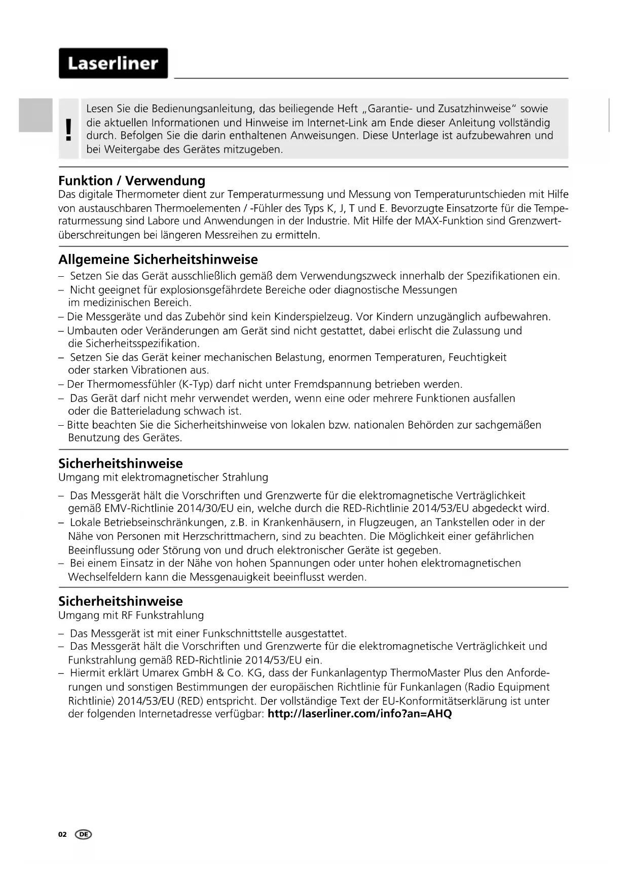 Sicherheitshinweise Umgang mit elektromagnetischer Strahlung – Das Messgerät hält die Vorschriften und Grenzwerte für die elektromagnetische Verträglichkeit gemäß EMV-Richtlinie 2014/30/EU ein, welche durch die RED-Richtlinie 2014/53/EU abgedeckt wird. – Lokale Betriebseinschränkungen, z.B. in Krankenhäusern, in Flugzeugen, an Tankstellen oder in der Nähe von Personen mit Herzschrittmachern, sind zu beachten. Die Möglichkeit einer gefährlichen Beeinussung oder Störung von und druch elektronischer Geräte ist gegeben. – Bei einem Einsatz in der Nähe von hohen Spannungen oder unter hohen elektromagnetischen Wechselfeldern kann die Messgenauigkeit beeinusst werden. Sicherheitshinweise Umgang mit RF Funkstrahlung – Das Messgerät ist mit einer Funkschnittstelle ausgestattet. – Das Messgerät hält die Vorschriften und Grenzwerte für die elektromagnetische Verträglichkeit und Funkstrahlung gemäß RED-Richtlinie 2014/53/EU ein. – Hiermit erklärt Umarex GmbH & Co. KG, dass der Funkanlagentyp ThermoMaster Plus den Anforde- rungen und sonstigen Bestimmungen der europäischen Richtlinie für Funkanlagen (Radio Equipment Richtlinie) 2014/53/EU (RED) entspricht. Der vollständige Text der EU-Konformitätserklärung ist unter der folgenden Internetadresse verfügbar: http://laserliner.com/info?an=AHQ Allgemeine Sicherheitshinweise – Setzen Sie das Gerät ausschließlich gemäß dem Verwendungszweck innerhalb der Spezikationen ein. – Nicht geeignet für explosionsgefährdete Bereiche oder diagnostische Messungen im medizinischen Bereich. – Die Messgeräte und das Zubehör sind kein Kinderspielzeug. Vor Kindern unzugänglich aufbewahren. – Umbauten oder Veränderungen am Gerät sind nicht gestattet, dabei erlischt die Zulassung und die Sicherheitsspezikation. – Setzen Sie das Gerät keiner mechanischen Belastung, enormen Temperaturen, Feuchtigkeit oder starken Vibrationen aus. – Der Thermomessfühler (K-Typ) darf nicht unter Fremdspannung betrieben werden. – Das Gerät darf nicht mehr verwendet werden, wenn eine oder mehrere Funktionen ausfallen oder die Batterieladung schwach ist. – Bitte beachten Sie die Sicherheitshinweise von lokalen bzw. nationalen Behörden zur sachgemäßen Benutzung des Gerätes. Funktion / Verwendung Das digitale Thermometer dient zur Temperaturmessung und Messung von Temperaturuntschieden mit Hilfe von austauschbaren Thermoelementen / -Fühler des Typs K, J, T und E. Bevorzugte Einsatzorte für die Tempe- raturmessung sind Labore und Anwendungen in der Industrie. Mit Hilfe der MAX-Funktion sind Grenzwert- überschreitungen bei längeren Messreihen zu ermitteln.ThermoMaster Plus