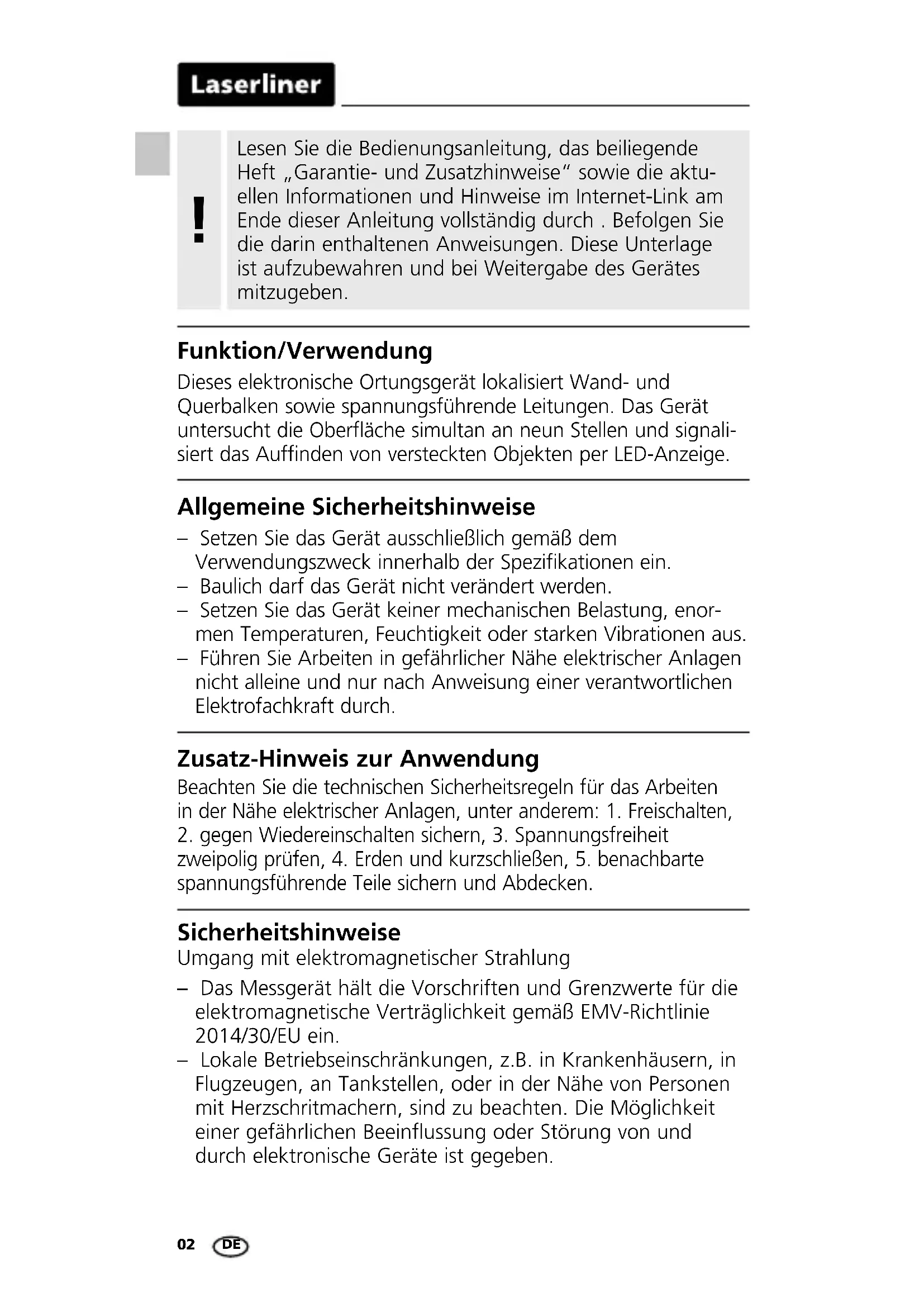 zweipolig prüfen, 4. Erden und kurzschließen, 5. benachbarte spannungsführende Teile sichern und Abdecken. Sicherheitshinweise Umgang mit elektromagnetischer Strahlung – Das Messgerät hält die Vorschriften und Grenzwerte für die elektromagnetische Verträglichkeit gemäß EMV-Richtlinie 2014/30/EU ein. – Lokale Betriebseinschränkungen, z.B. in Krankenhäusern, in Flugzeugen, an Tankstellen, oder in der Nähe von Personen mit Herzschritmachern, sind zu beachten. Die Möglichkeit einer gefährlichen Beeinflussung oder Störung von und durch elektronische Geräte ist gegeben. Dieses elektronische Ortungsgerät lokalisiert Wand- und Querbalken sowie spannungsführende Leitungen. Das Gerät untersucht die Oberfläche simultan an neun Stellen und signali- siert das Auffinden von versteckten Objekten per LED-Anzeige.