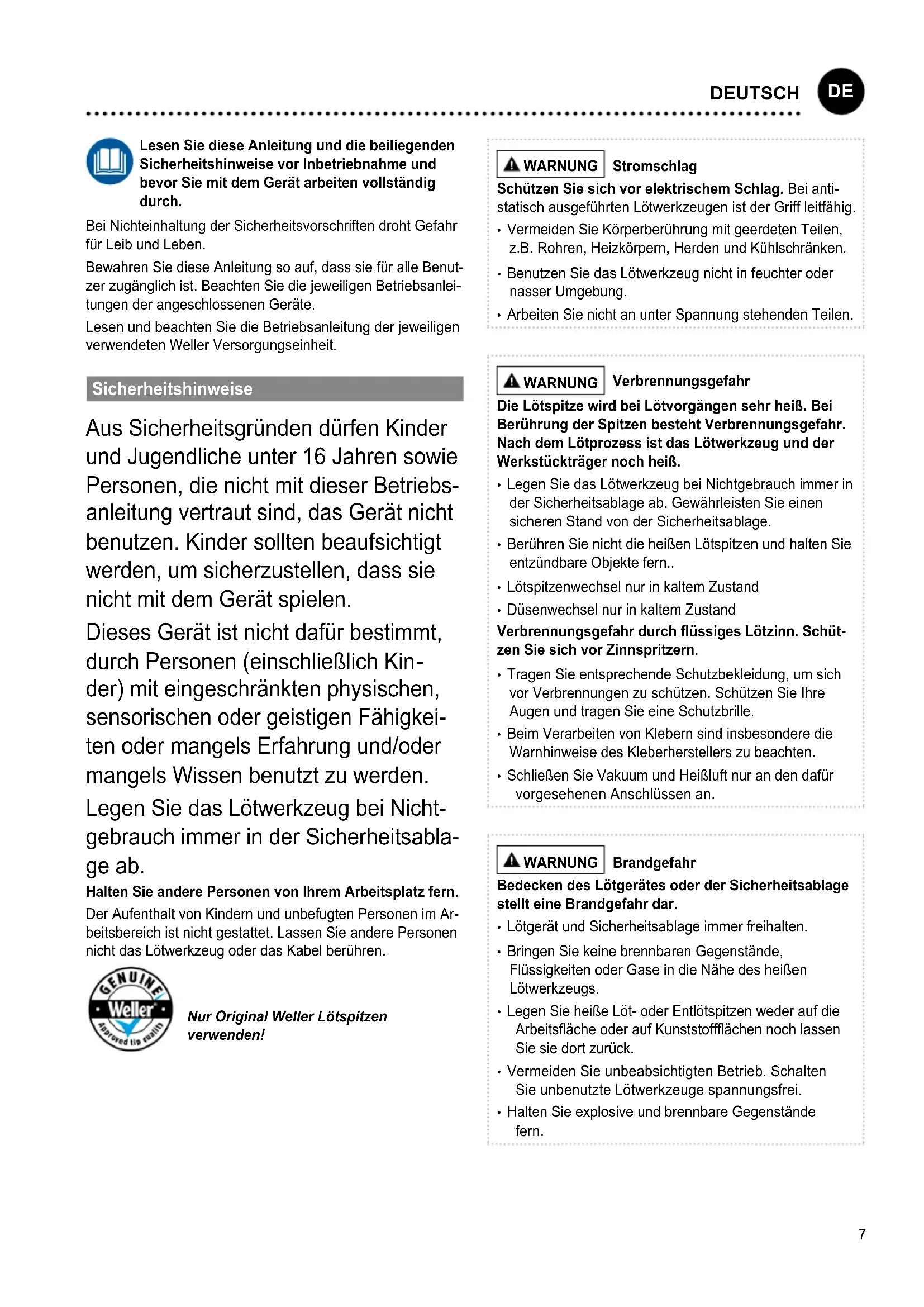 Lesen Sie diese Anleitung und die beiliegenden Sicherheitshinweise vor Inbetriebnahme und bevor Sie mit dem Gerät arbeiten vollständig durch. Bei Nichteinhaltung der Sicherheitsvorschriften droht Gefahr für Leib und Leben. Bewahren Sie diese Anleitung so auf, dass sie für alle Benut- zer zugänglich ist. Beachten Sie die jeweiligen Betriebsanlei- tungen der angeschlossenen Geräte. Lesen und beachten Sie die Betriebsanleitung der jeweiligen verwendeten Weller Versorgungseinheit. Sicherheitshinweise Aus Sicherheitsgründen dürfen Kinder und Jugendliche unter 16 Jahren sowie Personen, die nicht mit dieser Betriebs- anleitung vertraut sind, das Gerät nicht benutzen. Kinder sollten beaufsichtigt werden, um sicherzustellen, dass sie nicht mit dem Gerät spielen. Dieses Gerät ist nicht dafür bestimmt, durch Personen (einschließlich Kin