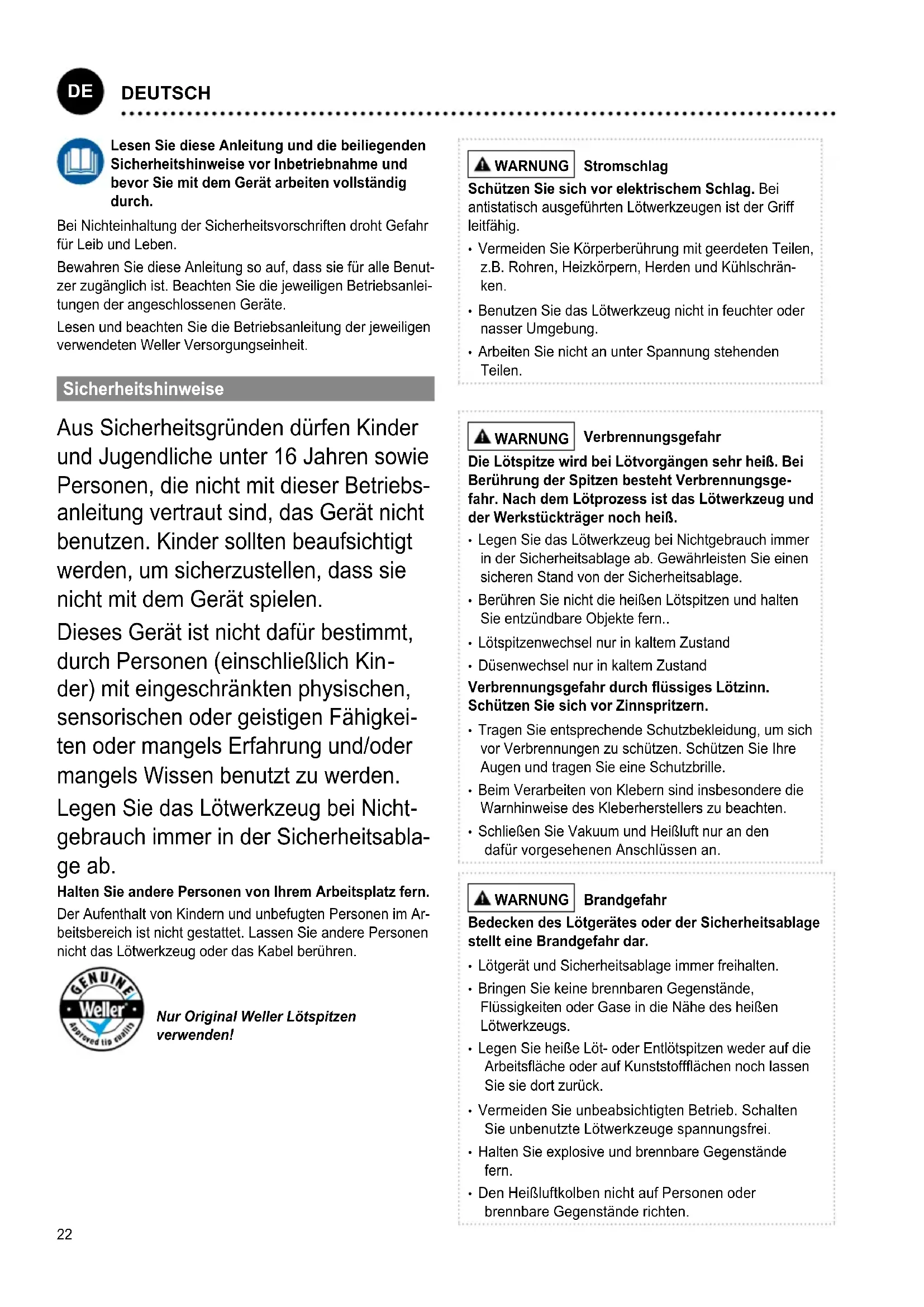 Lesen Sie diese Anleitung und die beiliegenden Sicherheitshinweise vor Inbetriebnahme und bevor Sie mit dem Gerät arbeiten vollständig durch. Bei Nichteinhaltung der Sicherheitsvorschriften droht Gefahr für Leib und Leben. Bewahren Sie diese Anleitung so auf, dass sie für alle Benut- zer zugänglich ist. Beachten Sie die jeweiligen Betriebsanlei- tungen der angeschlossenen Geräte. Lesen und beachten Sie die Betriebsanleitung der jeweiligen verwendeten Weller Versorgungseinheit. Sicherheitshinweise Aus Sicherheitsgründen dürfen Kinder und Jugendliche unter 16 Jahren sowie Personen, die nicht mit dieser Betriebs- anleitung vertraut sind, das Gerät nicht benutzen. Kinder sollten beaufsichtigt werden, um sicherzustellen, dass sie nicht mit dem Gerät spielen. Dieses Gerät ist nicht dafür bestimmt, durch Personen (einschließlich Kin