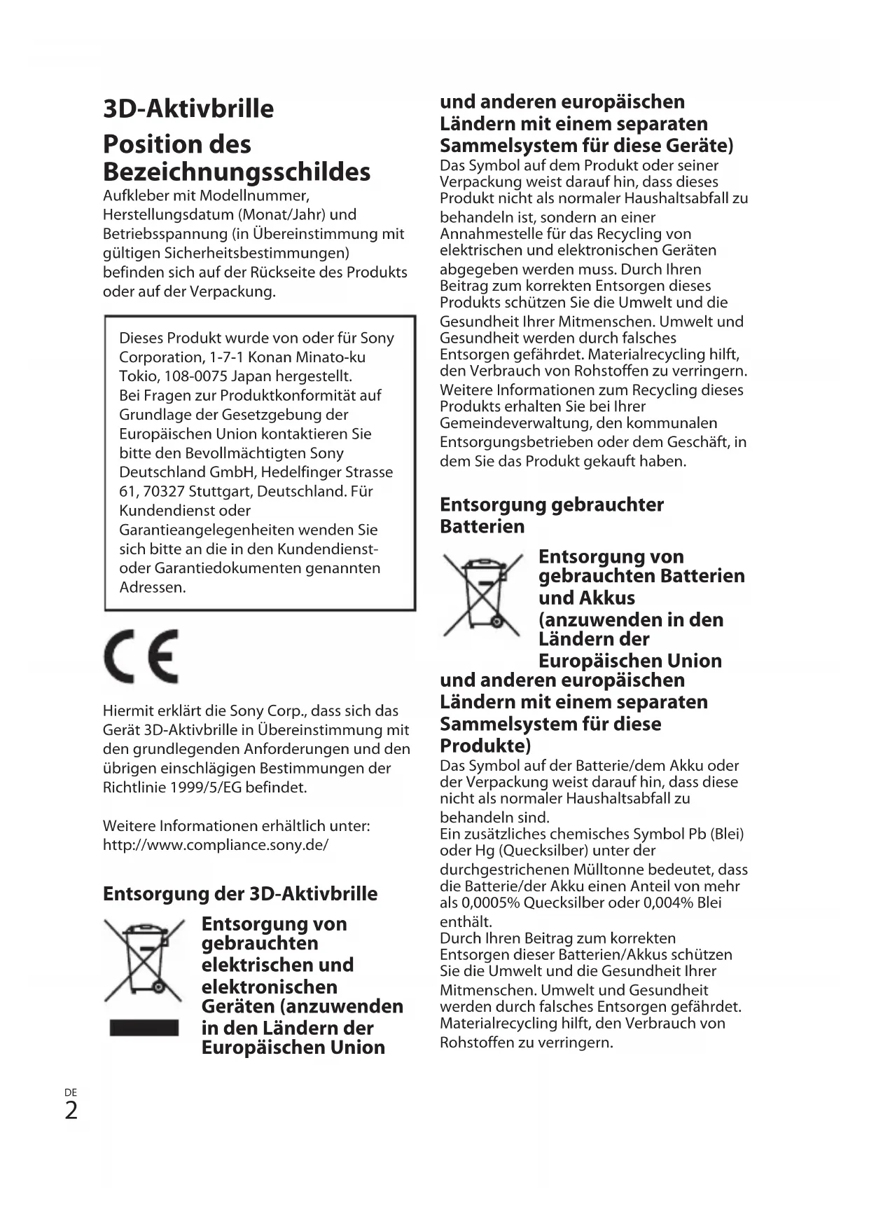 3D-Aktivbrille Position des Bezeichnungsschildes Aufkleber mit Modellnummer, Herstellungsdatum (Monat/Jahr) und Betriebsspannung (in Übereinstimmung mit gültigen Sicherheitsbestimmungen) befinden sich auf der Rückseite des Produkts oder auf der Verpackung. Dieses Produkt wurde von oder für Sony Corporation, 1-7-1 Konan Minato-ku Tokio, 108-0075 Japan hergestellt. Bei Fragen zur Produktkonformität auf Grundlage der Gesetzgebung der Europäischen Union kontaktieren Sie bitte den Bevollmächtigten Sony Deutschland GmbH, Hedelfinger Strasse 61, 70327 Stuttgart, Deutschland. Für Kundendienst oder Garantieangelegenheiten wenden Sie sich bitte an die in den Kundendienst- oder Garantiedokumenten genannten Adressen. Hiermit erklärt die Sony Corp., dass sich das Gerät 3D-Aktivbrille in Übereinstimmung mit den grundlegenden Anforderungen und den übrigen einschlägigen Bestimmungen der Richtlinie 1999/5/EG befindet. Weitere Informationen erhältlich unter: http://www.compliance.sony.de/ Entsorgung der 3D-Aktivbrille Entsorgung von gebrauchten elektrischen und elektronischen Geräten (anzuwenden in den Ländern der Europäischen Union und anderen europäischen Ländern mit einem separaten Sammelsystem für diese Geräte) Das Symbol auf dem Produkt oder seiner Verpackung weist darauf hin, dass dieses Produkt nicht als normaler Haushaltsabfall zu behandeln ist, sondern an einer Annahmestelle für das Recycling von elektrischen und elektronischen Geräten abgegeben werden muss. Durch Ihren Beitrag zum korrekten Entsorgen dieses Produkts schützen Sie die Umwelt und die Gesundheit Ihrer Mitmenschen. Umwelt und Gesundheit werden durch falsches Entsorgen gefährdet. Materialrecycling hilft, den Verbrauch von Rohstoffen zu verringern. Weitere Informationen zum Recycling dieses Produkts erhalten Sie bei Ihrer Gemeindeverwaltung, den kommunalen Entsorgungsbetrieben oder dem Geschäft, in dem Sie das Produkt gekauft haben. Entsorgung gebrauchter Batterien Entsorgung von gebrauchten Batterien und Akkus (anzuwenden in den Ländern der Europäischen Union und anderen europäischen Ländern mit einem separaten Sammelsystem für diese Produkte) Das Symbol auf der Batterie/dem Akku oder der Verpackung weist darauf hin, dass diese nicht als normaler Haushaltsabfall zu behandeln sind. Ein zusätzliches chemisches Symbol Pb (Blei) oder Hg (Quecksilber) unter der durchgestrichenen Mülltonne bedeutet, dass die Batterie/der Akku einen Anteil von mehr als 0,0005% Quecksilber oder 0,004% Blei enthält. Durch Ihren Beitrag zum korrekten Entsorgen dieser Batterien/Akkus schützen Sie die Umwelt und die Gesundheit Ihrer Mitmenschen. Umwelt und Gesundheit werden durch falsches Entsorgen gefährdet. Materialrecycling hilft, den Verbrauch von Rohstoffen zu verringern.3