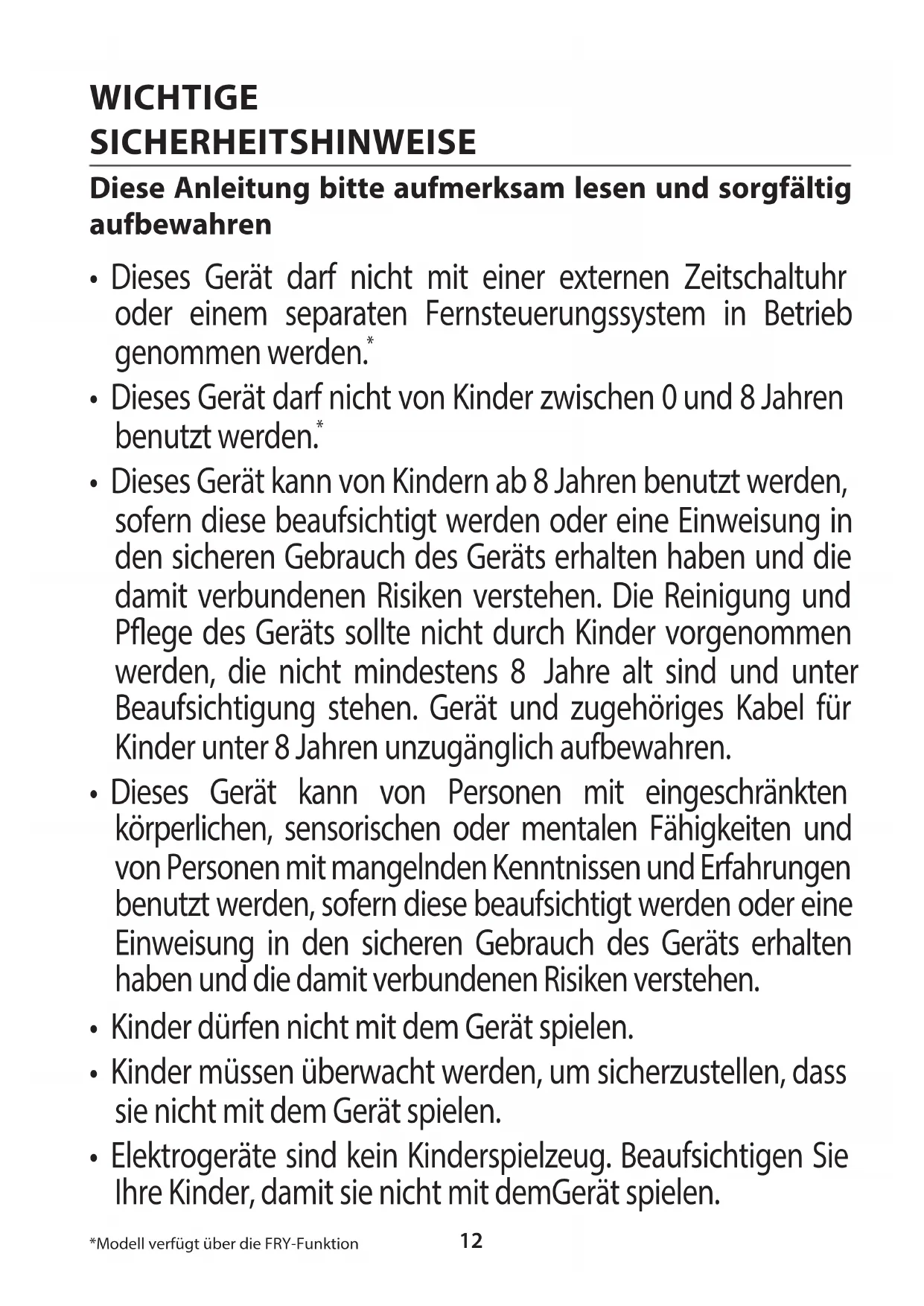 - Elektrogeräte sind kein Kinderspielzeug. Beaufsichtigen Sie Ihre Kinder, damit sie nicht mit demGerät spielen. *Modell verfügt über die FRY-Funktion13