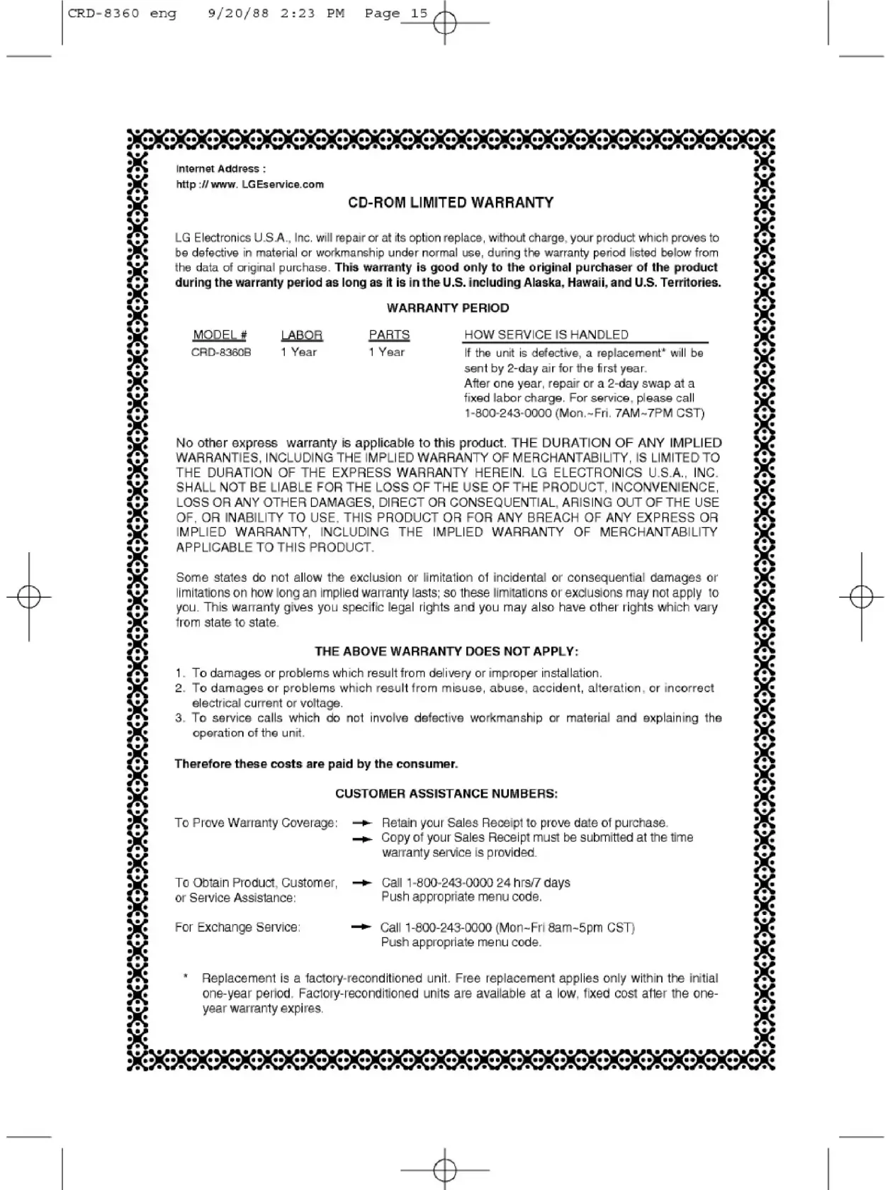 Finden Sie kostenlos die Bedienungsanleitung des Geräts CRD8360B LG als PDF.