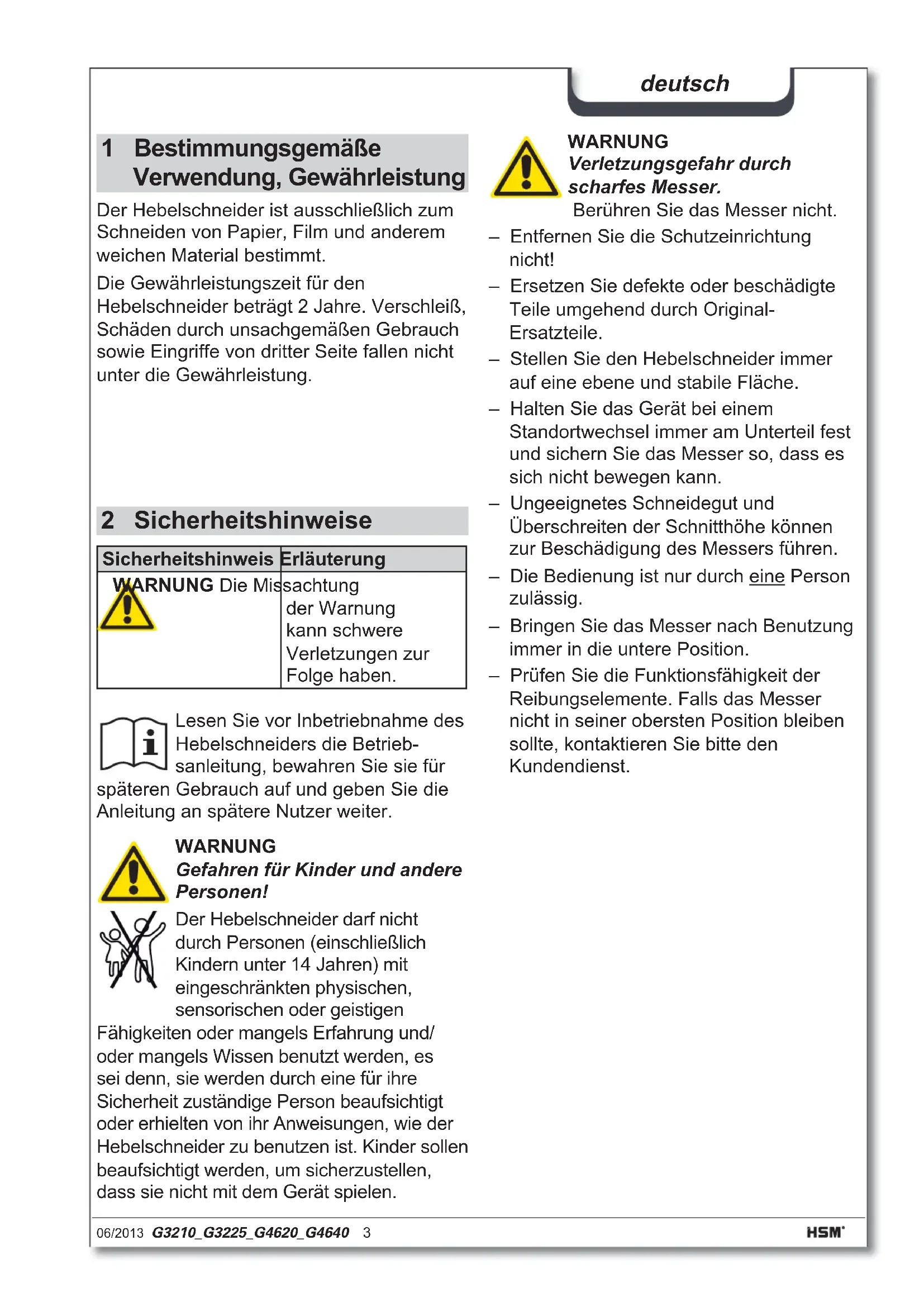 - türkçe: Kollu kağıt kesme makinesi /2013 G3210_G3225_G4620_G4640 3 deutsch 1 Bestimmungsgemäße Verwendung, Gewährleistung Der Hebelschneider ist ausschließlich zum Schneiden von Papier, Film und anderem weichen Material bestimmt. Die Gewährleistungszeit für den Hebelschneider beträgt 2 Jahre. Verschleiß, Schäden durch unsachgemäßen Gebrauch sowie Eingriffe von dritter Seite fallen nicht unter die Gewährleistung. 2 Sicherheitshinweise Sicherheitshinweis Erläuterung WARNUNG Die Missachtung der Warnung kann schwere Verletzungen zur Folge haben. Lesen Sie vor Inbetriebnahme des Hebelschneiders die Betrieb- sanleitung, bewahren Sie sie für späteren Gebrauch auf und geben Sie die Anleitung an spätere Nutzer weiter. WARNUNG Gefahren für Kinder und andere Personen! Der Hebelschneider darf nicht durch Personen (einschließlich Kindern unter 14 Jahren) mit eingeschränkten physischen, sensorischen oder geistigen Fähigkeiten oder mangels Erfahrung und/ oder mangels Wissen benutzt werden, es sei denn, sie werden durch eine für ihre Sicherheit zuständige Person beaufsichtigt oder erhielten von ihr Anweisungen, wie der Hebelschneider zu benutzen ist. Kinder sollen beaufsichtigt werden, um sicherzustellen, dass sie nicht mit dem Gerät spielen. WARNUNG Verletzungsgefahr durch scharfes Messer. Berühren Sie das Messer nicht. – Entfernen Sie die Schutzeinrichtung nicht! – Ersetzen Sie defekte oder beschädigte Teile umgehend durch Original- Ersatzteile. – Stellen Sie den Hebelschneider immer auf eine ebene und stabile Fläche. – Halten Sie das Gerät bei einem Standortwechsel immer am Unterteil fest und sichern Sie das Messer so, dass es sich nicht bewegen kann. – Ungeeignetes Schneidegut und Überschreiten der Schnitthöhe können zur Beschädigung des Messers führen. – Die Bedienung ist nur durch eine Person zulässig. – Bringen Sie das Messer nach Benutzung immer in die untere Position. – Prüfen Sie die Funktionsfähigkeit der Reibungselemente. Falls das Messer nicht in seiner obersten Position bleiben sollte, kontaktieren Sie bitte den Kundendienst.4 G3210_G3225_G4620_G4640 06/2013 deutsch p. 9506