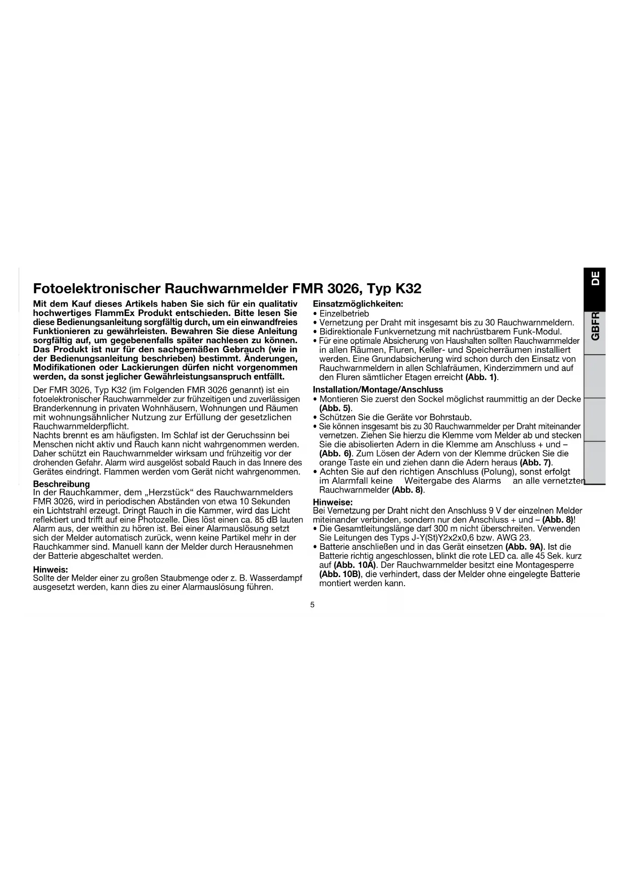 - BatterieanschließenundindasGeräteinsetzen(Abb. 9A).Istdie Batterierichtigangeschlossen,blinktdieroteLEDca.alle45Sek.kurz auf(Abb. 10A).DerRauchwarnmelderbesitzteineMontagesperre (Abb. 10B),dieverhindert,dassderMelderohneeingelegteBatterie montiertwerdenkann. Mit dem Kauf dieses Artikels haben Sie sich für ein qualitativ hochwertiges FlammEx Produkt entschieden. Bitte lesen Sie diese Bedienungsanleitung sorgfältig durch, um ein einwandfreies Funktionieren zu gewährleisten. Bewahren Sie diese Anleitung sorgfältig auf, um gegebenenfalls später nachlesen zu können. Das Produkt ist nur für den sachgemäßen Gebrauch (wie in der Bedienungsanleitung beschrieben) bestimmt. Änderungen, Modifikationen oder Lackierungen dürfen nicht vorgenommen werden, da sonst jeglicher Gewährleistungsanspruch entfällt. DerFMR3026,TypK32(imFolgendenFMR3026genannt)istein fotoelektronischerRauchwarnmelderzurfrühzeitigenundzuverlässigen BranderkennunginprivatenWohnhäusern,WohnungenundRäumen mitwohnungsähnlicherNutzungzurErfüllungdergesetzlichen Rauchwarnmelderpicht. Nachtsbrenntesamhäugsten.ImSchlafistderGeruchssinnbei MenschennichtaktivundRauchkannnichtwahrgenommenwerden. DaherschützteinRauchwarnmelderwirksamundfrühzeitigvorder drohendenGefahr.AlarmwirdausgelöstsobaldRauchindasInneredes Geräteseindringt.FlammenwerdenvomGerätnichtwahrgenommen. Beschreibung InderRauchkammer,dem„Herzstück“desRauchwarnmelders FMR3026,wirdinperiodischenAbständenvonetwa10Sekunden einLichtstrahlerzeugt.DringtRauchindieKammer,wirddasLicht reektiertundtritaufeinePhotozelle.Dieslösteinenca.85dBlauten Alarmaus,derweithinzuhörenist.BeieinerAlarmauslösungsetzt sichderMelderautomatischzurück,wennkeinePartikelmehrinder Rauchkammersind.ManuellkannderMelderdurchHerausnehmen derBatterieabgeschaltetwerden. Hinweis: SolltederMeldereinerzugroßenStaubmengeoderz.B.Wasserdampf ausgesetztwerden,kanndieszueinerAlarmauslösungführen. Fotoelektronischer Rauchwarnmelder FMR 3026, Typ K32 GBFRITPL DE6