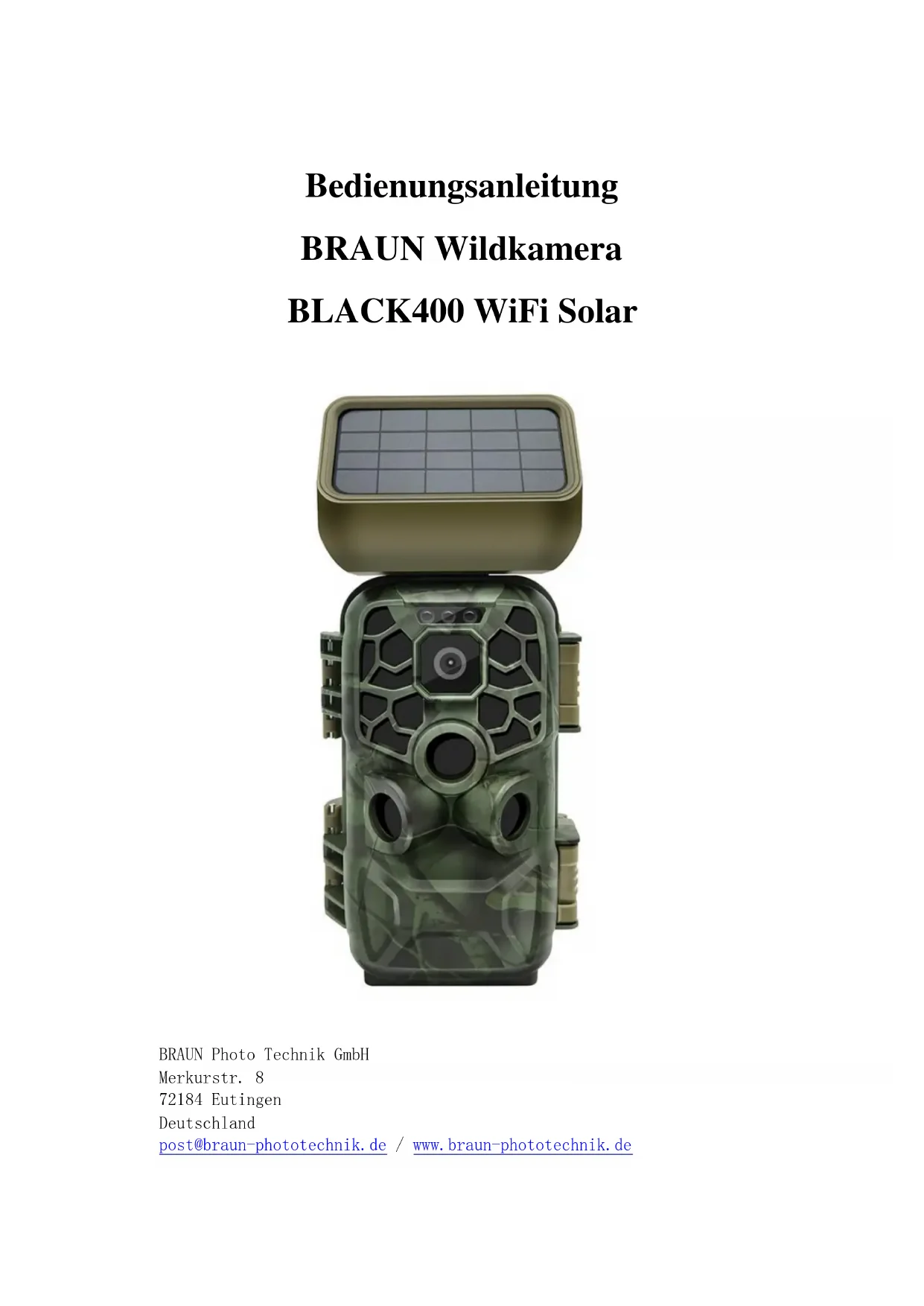 Solarmodul nach unten. Die Verriegelung schnappt automatisch ein. Drücken Sie die Verriegelungstaste, um das Solarmodul abzunehmen.Installation Achten Sie bei der Installation des Solarmoduls darauf, dass kein Laub oder Äste die Sonneneinstrahlung behindern. Am besten ist es, die Kamera im Freien zu installieren Schließen Sie das Verbindungskabel am DC-Ausgang des Solarmoduls am DC-Eingang der Kamera an. Wenn Anschlüsse des Solarmoduls nicht verwendet werden, verschließen Sie diese mit dem Silikonstopfen, um ein Eindringen von Feuchtigkeit oder Fremdkörpern in das Gerät zu verhindern. Technische Daten Produkt: Solar-Powerbank DC-Eingang: 12 V/DC DC-Ausgang: 6,0 V/DC, max. 2 A (Typ-C) Kapazität: 2500 mAh Überladeschutz und Entladeschutz: Ja Wasserfestigkeit: IP65 Betriebstemperatur: -20 °C bis +60 °C Abmessungen: 97 x 70 x 43 mm Hinweis: Die technischen Daten des Produkts basieren auf den neuesten Informationen zum Zeitpunkt der Erstellung dieses Handbuchs. Änderungen ohne Vorankündigung vorbehalten. BRAUN Photo Technik GmbH Merkurstr. 8 72184 Eutingen Deutschland post@braun-phototechnik.de / www.braun-phototechnik.deUser Manual BRAUN Scouting Cam Black400 WiFi Solar