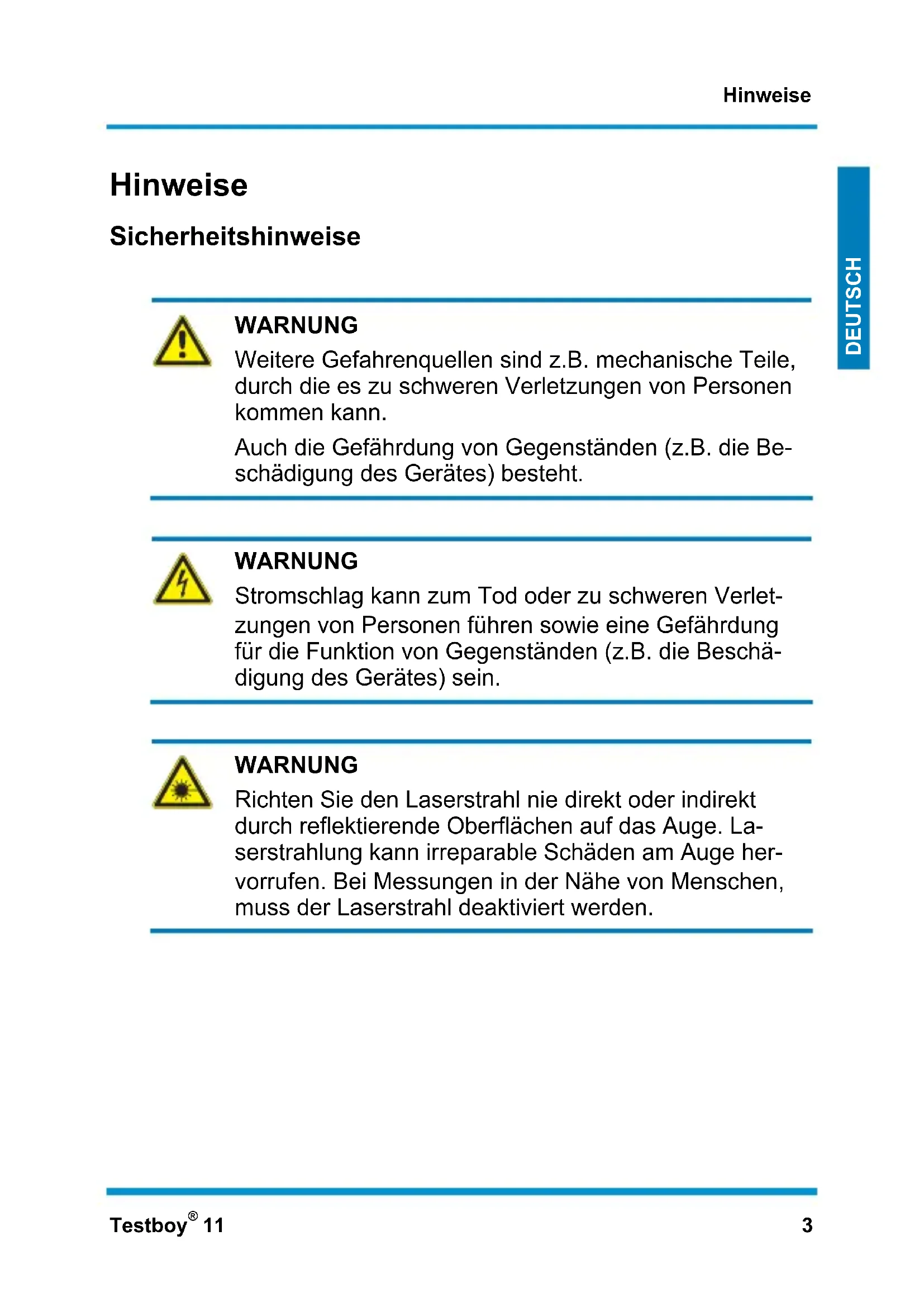 WARNUNG Richten Sie den Laserstrahl nie direkt oder indirekt durch reflektierende Oberflächen auf das Auge. La- serstrahlung kann irreparable Schäden am Auge her- vorrufen. Bei Messungen in der Nähe von Menschen, muss der Laserstrahl deaktiviert werden.Hinweise 4 Testboy