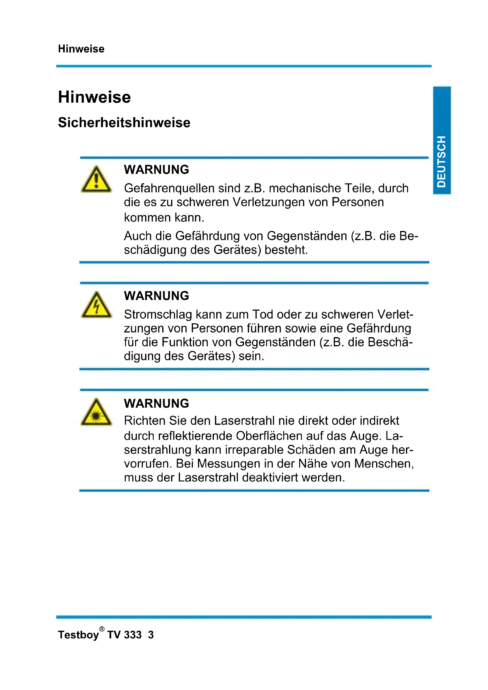 WARNUNG Richten Sie den Laserstrahl nie direkt oder indirekt durch reflektierende Oberflächen auf das Auge. La- serstrahlung kann irreparable Schäden am Auge her- vorrufen. Bei Messungen in der Nähe von Menschen, muss der Laserstrahl deaktiviert werden.Hinweise 4 Testboy