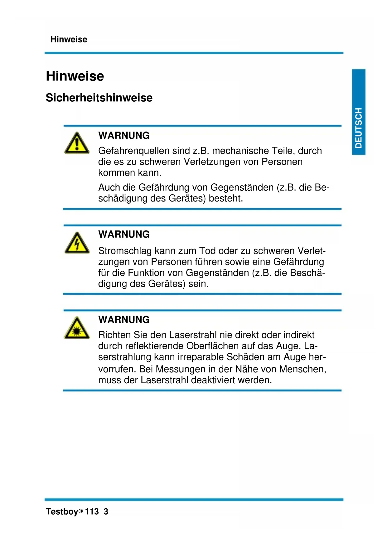 WARNUNG Richten Sie den Laserstrahl nie direkt oder indirekt durch reflektierende Oberflächen auf das Auge. La- serstrahlung kann irreparable Schäden am Auge her- vorrufen. Bei Messungen in der Nähe von Menschen, muss der Laserstrahl deaktiviert werden.Hinweise 4 Testboy