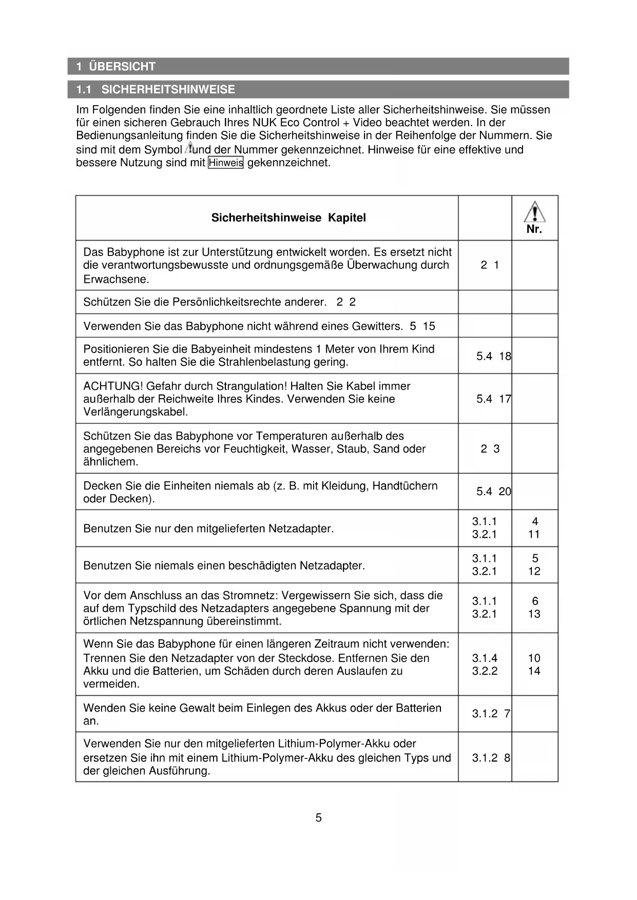 Im Folgenden finden Sie eine inhaltlich geordnete Liste aller Sicherheitshinweise. Sie müssen für einen sicheren Gebrauch Ihres NUK Eco Control + Video beachtet werden. In der Bedienungsanleitung finden Sie die Sicherheitshinweise in der Reihenfolge der Nummern. Sie sind mit dem Symbol und der Nummer gekennzeichnet. Hinweise für eine effektive und bessere Nutzung sind mit Hinweis gekennzeichnet.