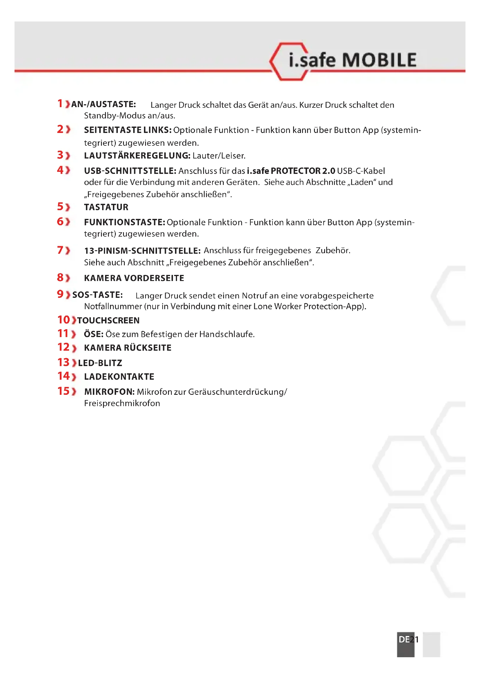 2 SEITENTASTE LINKS: Optionale Funktion - Funktion kann über Button App (systemin- tegriert) zugewiesen werden. 3 LAUTSTÄRKEREGELUNG: Lauter/Leiser. 4 USBSCHNITTSTELLE: Anschluss für das i.safe PROTECTOR2.0 USB-C-Kabel oder für die Verbindung mit anderen Geräten. Siehe auch Abschnitte „Laden“ und „Freigegebenes Zubehör anschließen“. 5 TASTATUR 6 FUNKTIONSTASTE: Optionale Funktion - Funktion kann über Button App (systemin- tegriert) zugewiesen werden.