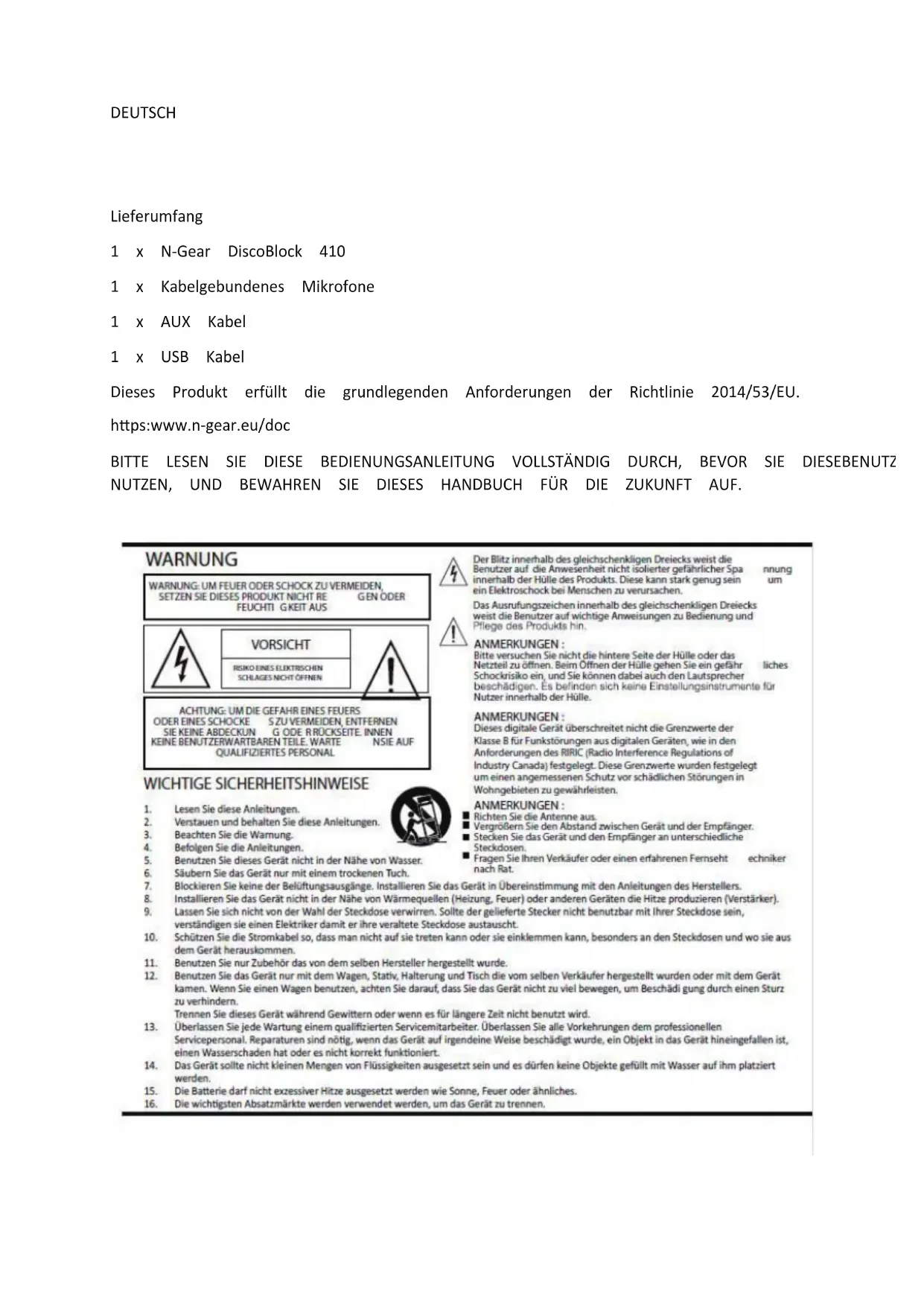- Stecken Sie das 3,5-mm-Audiokabel in den AUX-Eingang auf der Rückseite des Lautsprechers. - Sie können jedes Audiogerät mit einer 3,5-mm-Audioausgangsbuchse anschließen und jedes Audio von diesem Gerät wiedergeben. Schließen Sie ein Mikrofon an - Stecken Sie Ihr Mikrofon (6,3-mm-Stecker) in den MIC-Eingang auf der Rückseite des Lautsprechers. - Stellen Sie die Mikrofonlautstärke vor dem Lautsprecher auf den gewünschten Schallpegel ein. HÖREN VON USB DRIVE / MICRO SD - Stecken Sie Ihren USB-Sck oder Ihre Micro-SD-Karte in die Rückseite des Lautsprechers. - Ihr Lautsprecher gibt automasch Musik von Ihrem ausgewählten Gerät USB oder Micro SD wieder. Technische Daten Spitzenleistung 30W Stromaufnahme MicroUSB USB 5V,1A Spitzenleistung PMPO 30W RMS-Leistung 3W Frequenzgang 60Hz-18KHz Woofergröße + Impedanz 4 S/N-Verhältnis ≥72dB Akkutyp Li-ion Akkukapazität 1500 mAh Akkuspielzeit (Max vol.) 2 Stunden Akkuspielzeit (50% vol.) 3 Stunden Akkuspielzeit (Low vol.) 6 Stunden Akkuladezeit 3 Stunden Gewicht der Akku 35gr Bluetooth Version 5.1 Bluetooth Frequenz 2400-2483.5MHzUSB MP3 64GB MicroSD/TF MP3 64GB Abmessungen: 183 x 183 x 265 mm Neogewicht 1400gr Der Unterzeichnete, Neeskens Internaonal, erklärt, dass die Funkanlage des Typs Block Disco Block 410 der Richtlinie 2014/53/EU entspricht. Den vollständigen Text finden Sie unter www.n-gear.eu Wenn dieses Symbol einer durchgestrichenen Mülltonne an einem Produkt angebracht ist, bedeutet dies, dass das Produkt von der Europäischen Union abgedeckt wird Richtlinie2012/19/EU. Bie informieren Sie sich über die lokale Getrenntes Sammelsystem für Elektro-und Elektronikprodukte Bie beachten Sie die örtlichen Vorschrien und entsorgen Sie Ihre Altgeräte nicht mit normalem Hausmüll. Die korrekte Entsorgung Ihres alten Produkts hil, mögliche negave Folgen für die Umwelt und die menschliche Gesundheit zu vermeiden. Vor dem Wegwerfen zu einem Knoten binden. Dieses Produkt entspricht den Anforderungen von Europa In China hergestellt Hergestellt für N-Gear N-Gear Office Salland 9 1948RE Beverwijk The Netherlands www.n-gear.euESPAÑOL Contenido 1 x N-Gear DiscoBlock 410 1 x Micrófonos con cable incluido 1 x Cable de AUX 1 x Cable de USB Este producto cumple con los requisitos esenciales de la Direcva 2014/53/EU. hps:www.n-gear.eu/doc POR FAVOR, LEA ESTAS INSTRUCCIONES ANTES DE UTILIZAR ESTE USO,Y CONSERVE ESTE MANUAL PARA EL FUTURO.INTERRUPTOR DE ENCENDIDO / APAGADO - Presione el interruptor de encendido para colocar la posición 'I' en el panel posterior del altavoz. - La unidad entrará en modo Bluetooth y la luz LED parpadeará en azul. - La luz de la bola de discoteca permanecerá apagada. Encendido / apagado en modo de luz de fiesta - Presione el interruptor POWER en la posición 'II' en el panel posterior del altavoz. - La unidad entrará en modo Bluetooth y la luz LED parpadeará en azul. - La luz de la bola de discoteca se encenderá. - Ajuste el volumen al nivel deseado girando el control de volumen. BATERIA CARGANDO - Al conectar el cable de carga micro USB (incluido) a la parte posterior de la unidad y el adaptador USB a USB (no incluido) a una toma de corriente alterna. - El empo de carga es de aproximadamente 5-6 horas en modo de apagado. - En el modo de carga, el panel posterior mostrará un indicador de luz roja y cuando se complete la carga, la luz se apagará.