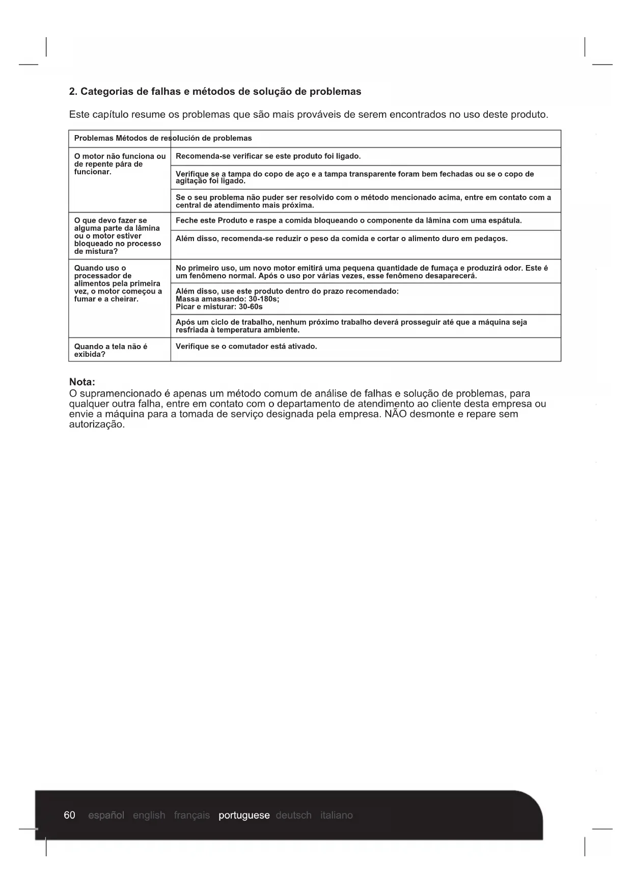 - Geräte können von Personen mit eingeschränkten61español english français portuguese deutsch italiano Problemas Métodos de resolución de problemas O motor não funciona ou de repente pára de funcionar. Recomenda-se vericar se este produto foi ligado. Verique se a tampa do copo de aço e a tampa transparente foram bem fechadas ou se o copo de agitação foi ligado. Se o seu problema não puder ser resolvido com o método mencionado acima, entre em contato com a central de atendimento mais próxima. O que devo fazer se alguma parte da lâmina ou o motor estiver bloqueado no processo de mistura? Feche este Produto e raspe a comida bloqueando o componente da lâmina com uma espátula. Além disso, recomenda-se reduzir o peso da comida e cortar o alimento duro em pedaços. Quando uso o processador de alimentos pela primeira vez, o motor começou a fumar e a cheirar. No primeiro uso, um novo motor emitirá uma pequena quantidade de fumaça e produzirá odor. Este é um fenômeno normal. Após o uso por várias vezes, esse fenômeno desaparecerá. Além disso, use este produto dentro do prazo recomendado: Massa amassando: 30-180s; Picar e misturar: 30-60s Após um ciclo de trabalho, nenhum próximo trabalho deverá prosseguir até que a máquina seja resfriada à temperatura ambiente. Quando a tela não é exibida? Verique se o comutador está ativado. WICHTIGE SICHERHEITSMASSNAHMEN