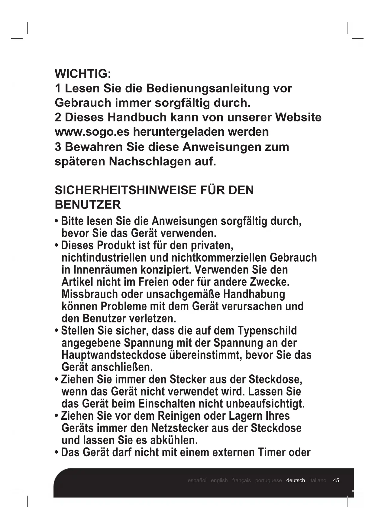 WICHTIG: 1 Lesen Sie die Bedienungsanleitung vor Gebrauch immer sorgfältig durch. 2 Dieses Handbuch kann von unserer Website www.sogo.es heruntergeladen werden 3 Bewahren Sie diese Anweisungen zum späteren Nachschlagen auf.