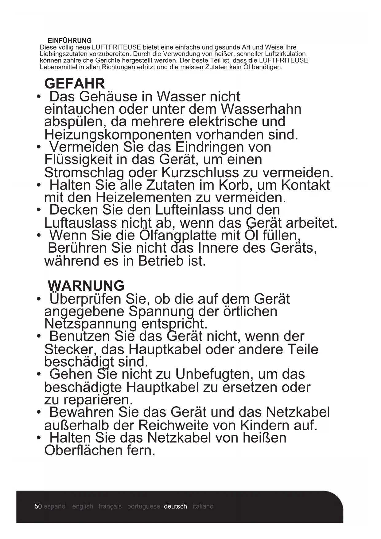 Verwendung der Rotisserie-Luftfritteuse ohne Voreinstellungen Wenn Sie mit der Rotisserie-Luftfritteuse vertraut sind, möchten Sie vielleicht selbst experimentieren. Warnung Verwenden Sie mit diesem Gerät niemals ein Kochgefäß, das mit Speiseöl oder anderen Flüssigkeiten gefüllt ist! Feuergefahr oder Körperverletzung können die Folge sein.56 español english français portuguese deutsch italiano FLEISCHTEMPERATUR Diese Tabelle sollte verwendet werden, um die Innentemperatur für gekochtes Fleisch zu überprüfen.