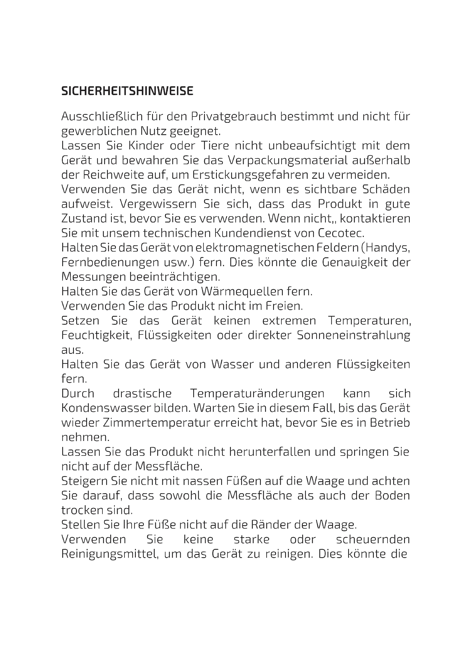 DEUTSCH Verwenden Sie zum Reinigen der Waage ein weiches, feuchtes Tuch. Verwenden Sie gegebenenfalls ein mildes Reinigungsmittel. Bewahren Sie das Gerät an einem sauberen, trockenen Ort auf, der vor direkter Sonneneinstrahlung geschützt und außerhalb der Reichweite von Kindern liegt, solange es nicht in Betrieb ist.