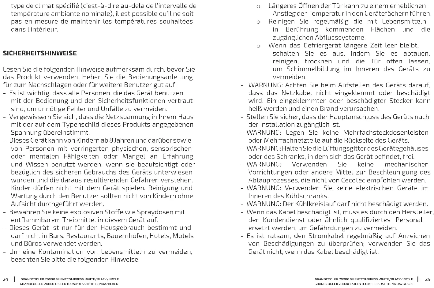 type de climat spécié (c’est-à-dire au-delà de l’intervalle de température ambiante nominale), il est possible qu’il ne soit pas en mesure de maintenir les températures souhaitées dans l’intérieur. SICHERHEITSHINWEISE Lesen Sie die folgenden Hinweise aufmerksam durch, bevor Sie das Produkt verwenden. Heben Sie die Bedienungsanleitung für zum Nachschlagen oder für weitere Benutzer gut auf. - Es ist wichtig, dass alle Personen, die das Gerät benutzen, mit der Bedienung und den Sicherheitsfunktionen vertraut sind, um unnötige Fehler und Unfälle zu vermeiden. - Vergewissern Sie sich, dass die Netzspannung in Ihrem Haus mit der auf dem Typenschild dieses Produkts angegebenen Spannung übereinstimmt. - Dieses Gerät kann von Kindern ab 8 Jahren und darüber sowie von Personen mit verringerten physischen, sensorischen oder mentalen Fähigkeiten oder Mangel an Erfahrung und Wissen benutzt werden, wenn sie beaufsichtigt oder bezüglich des sicheren Gebrauchs des Geräts unterwiesen wurden und die daraus resultierenden Gefahren verstehen. Kinder dürfen nicht mit dem Gerät spielen. Reinigung und Wartung durch den Benutzer sollten nicht von Kindern ohne Aufsicht durchgeführt werden. - Bewahren Sie keine explosiven Stoe wie Spraydosen mit entammbarem Treibmittel in diesem Gerät auf. - Dieses Gerät ist nur für den Hausgebrauch bestimmt und darf nicht in Bars, Restaurants, Bauernhöfen, Hotels, Motels und Büros verwendet werden. - Um eine Kontamination von Lebensmitteln zu vermeiden, beachten Sie bitte die folgenden Hinweise: o Längeres Önen der Tür kann zu einem erheblichen Anstieg der Temperatur in den Gerätefächern führen. o Reinigen Sie regelmäßig die mit Lebensmitteln in Berührung kommenden Flächen und die zugänglichen Abusssysteme. o Wenn das Gefriergerät längere Zeit leer bleibt, schalten Sie es aus, indem Sie es abtauen, reinigen, trocknen und die Tür oen lassen, um Schimmelbildung im Inneren des Geräts zu vermeiden. - WARNUNG: Achten Sie beim Aufstellen des Geräts darauf, dass das Netzkabel nicht eingeklemmt oder beschädigt wird. Ein eingeklemmter oder beschädigter Stecker kann heiß werden und einen Brand verursachen. - Stellen Sie sicher, dass der Hauptanschluss des Geräts nach der Installation zugänglich ist. - WARNUNG: Legen Sie keine Mehrfachsteckdosenleisten oder Mehrfachnetzteile auf die Rückseite des Geräts. - WARNUNG: Halten Sie die Lüftungsgitter des Gerätegehäuses oder des Schranks, in dem sich das Gerät bendet, frei. - WARNUNG: Verwenden Sie keine mechanischen Vorrichtungen oder andere Mittel zur Beschleunigung des Abtauprozesses, die nicht von Cecotec empfohlen werden. - WARNUNG: Verwenden Sie keine elektrischen Geräte im Inneren des Kühlschranks. - WARNUNG: Der Kühlkreislauf darf nicht beschädigt werden. - Wenn das Kabel beschädigt ist, muss es durch den Hersteller, den Kundendienst oder ähnlich qualiziertes Personal ersetzt werden, um Gefährdungen zu vermeiden. - Es ist ratsam, den Stromkabel regelmäßig auf Anzeichen von Beschädigungen zu überprüfen; verwenden Sie das Gerät nicht, wenn das Kabel beschädigt ist.2726
