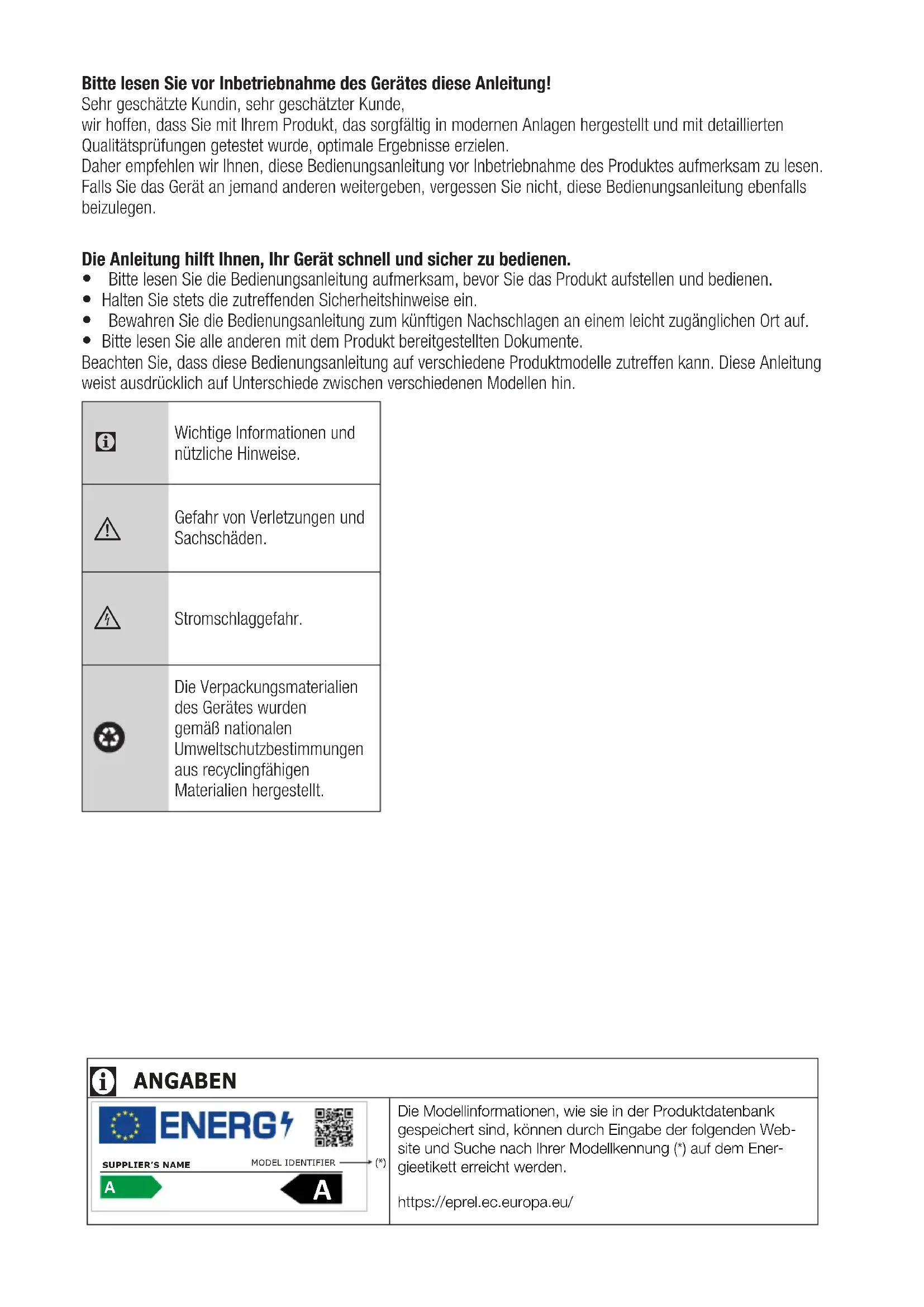Die Modellinformationen, wie sie in der Produktdatenbank gespeichert sind, können durch Eingabe der folgenden Web-site und Suche nach Ihrer Modellkennung (*) auf dem Ener-gieetikett erreicht werden.https://eprel.ec.europa.eu/