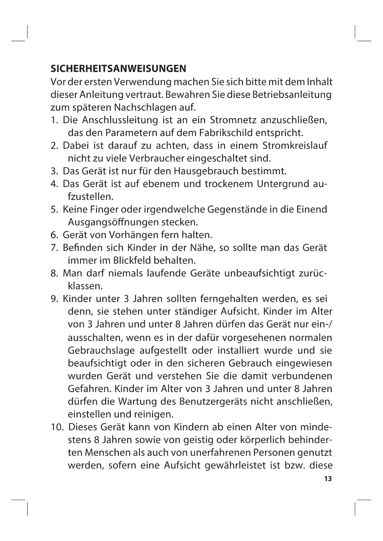 stens 8 Jahren sowie von geistig oder körperlich behinder- ten Menschen als auch von unerfahrenen Personen genutzt werden, sofern eine Aufsicht gewährleistet ist bzw. diese14 Personen im sicheren Umgang geschult worden sind und sich über alle damit verbundenen Gefahren im Klaren sind. Kinder sollten mit dem Gerät nicht spielen. Kinder dürfen das Gerät ohne Aufsicht weder reinigen noch warten.
