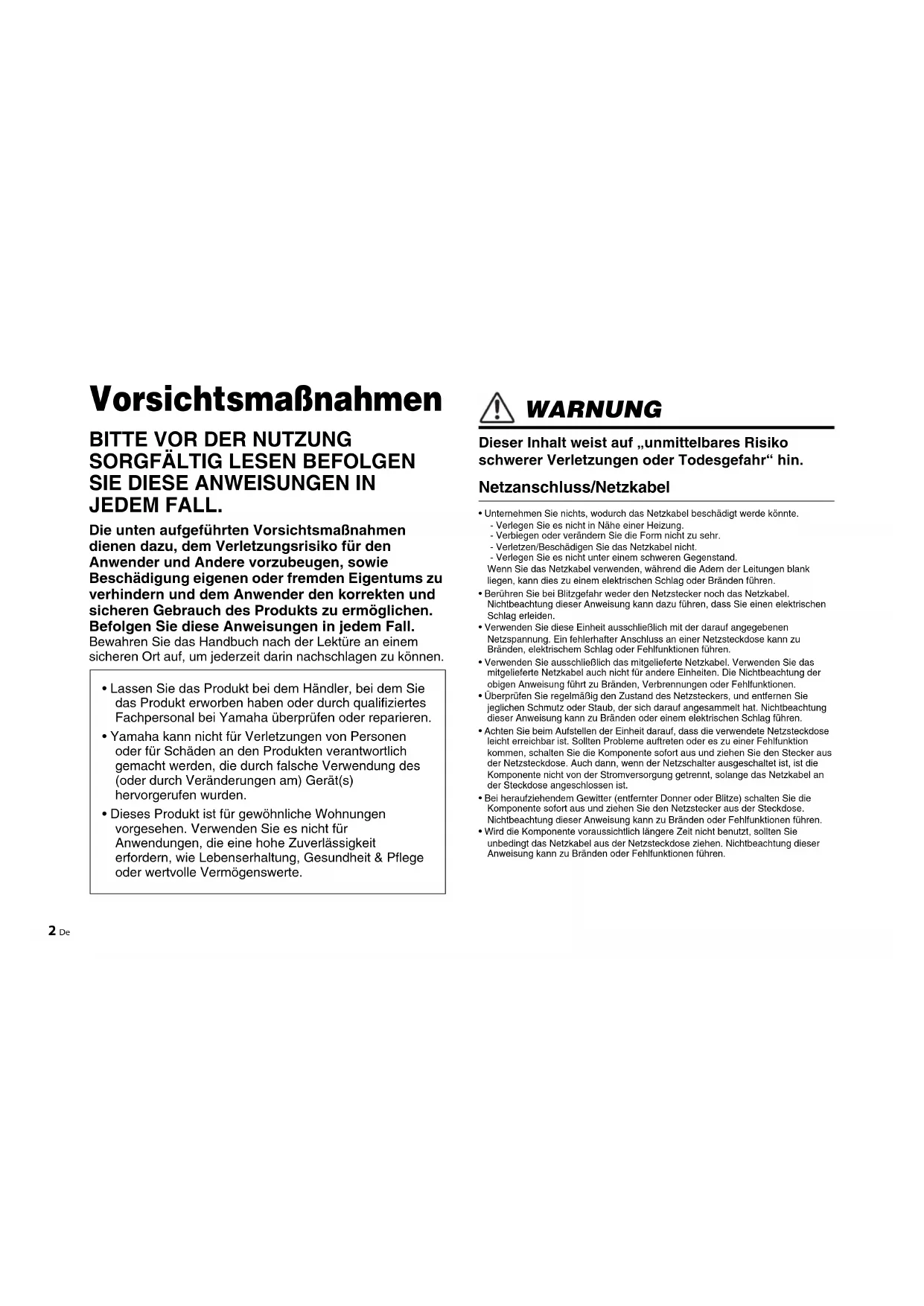 - Unternehmen Sie nichts, wodurch das Netzkabel beschädigt werde könnte.- Verlegen Sie es nicht in Nähe einer Heizung.- Verbiegen oder verändern Sie die Form nicht zu sehr.- Verletzen/Beschädigen Sie das Netzkabel nicht.- Verlegen Sie es nicht unter einem schweren Gegenstand.Wenn Sie das Netzkabel verwenden, während die Adern der Leitungen blank liegen, kann dies zu einem elektrischen Schlag oder Bränden führen.• Berühren Sie bei Blitzgefahr weder den Netzstecker noch das Netzkabel. Nichtbeachtung dieser Anweisung kann dazu führen, dass Sie einen elektrischen Schlag erleiden.• Verwenden Sie diese Einheit ausschließlich mit der darauf angegebenen Netzspannung. Ein fehlerhafter Anschluss an einer Netzsteckdose kann zu Bränden, elektrischem Schlag oder Fehlfunktionen führen.• Verwenden Sie ausschließlich das mitgelieferte Netzkabel. Verwenden Sie das mitgelieferte Netzkabel auch nicht für andere Einheiten. Die Nichtbeachtung der obigen Anweisung führt zu Bränden, Verbrennungen oder Fehlfunktionen.• Überprüfen Sie regelmäßig den Zustand des Netzsteckers, und entfernen Sie jeglichen Schmutz oder Staub, der sich darauf angesammelt hat. Nichtbeachtung dieser Anweisung kann zu Bränden oder einem elektrischen Schlag führen.• Achten Sie beim Aufstellen der Einheit darauf, dass die verwendete Netzsteckdose leicht erreichbar ist. Sollten Probleme auftreten oder es zu einer Fehlfunktion kommen, schalten Sie die Komponente sofort aus und ziehen Sie den Stecker aus der Netzsteckdose. Auch dann, wenn der Netzschalter ausgeschaltet ist, ist die Komponente nicht von der Stromversorgung getrennt, solange das Netzkabel an der Steckdose angeschlossen ist.• Bei heraufziehendem Gewitter (entfernter Donner oder Blitze) schalten Sie die Komponente sofort aus und ziehen Sie den Netzstecker aus der Steckdose. Nichtbeachtung dieser Anweisung kann zu Bränden oder Fehlfunktionen führen.• Wird die Komponente voraussichtlich längere Zeit nicht benutzt, sollten Sie unbedingt das Netzkabel aus der Netzsteckdose ziehen. Nichtbeachtung dieser Anweisung kann zu Bränden oder Fehlfunktionen führen.• Lassen Sie das Produkt bei dem Händler, bei dem Sie das Produkt erworben haben oder durch qualifiziertes Fachpersonal bei Yamaha überprüfen oder reparieren.• Yamaha kann nicht für Verletzungen von Personen oder für Schäden an den Produkten verantwortlich gemacht werden, die durch falsche Verwendung des (oder durch Veränderungen am) Gerät(s) hervorgerufen wurden.• Dieses Produkt ist für gewöhnliche Wohnungen vorgesehen. Verwenden Sie es nicht für Anwendungen, die eine hohe Zuverlässigkeit erfordern, wie Lebenserhaltung, Gesundheit & Pflege oder wertvolle Vermögenswerte.De 3 Nicht auseinanderbauen