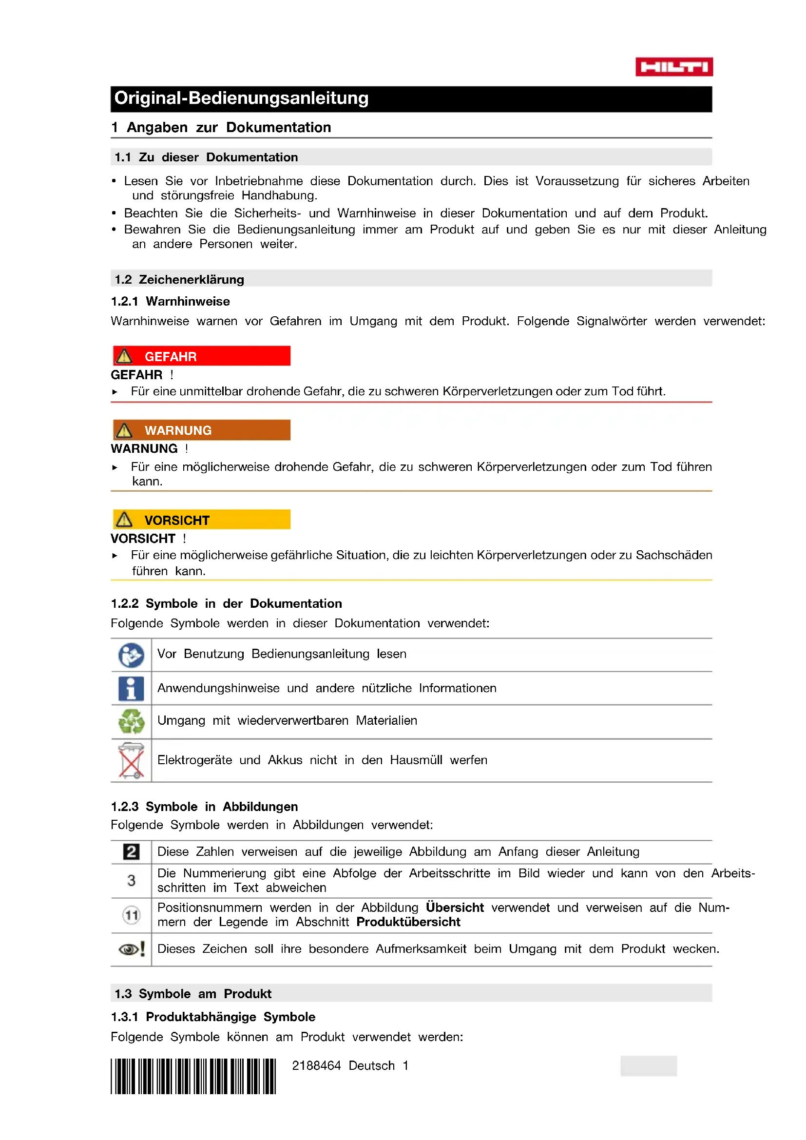 Folgende Symbole können am Produkt verwendet werden:2 Deutsch 2188464 *2188464* Quetschgefahr! Gleichstrom Das Gerät unterstützt NFC-Technologie, die mit iOS- und Android-Plattformen kompatibel ist. Li-Ionen Akku Verwendete Hilti Li-Ion-Akku Typenreihe. Beachten Sie die Angaben im Kapitel Bestimmungsge- mäße Verwendung. Benutzen Sie den Akku niemals als Schlagwerkzeug. Lassen Sie den Akku nicht fallen. Verwenden Sie keinen Akku, der einen Schlag erhalten hat oder anderweitig beschädigt ist.