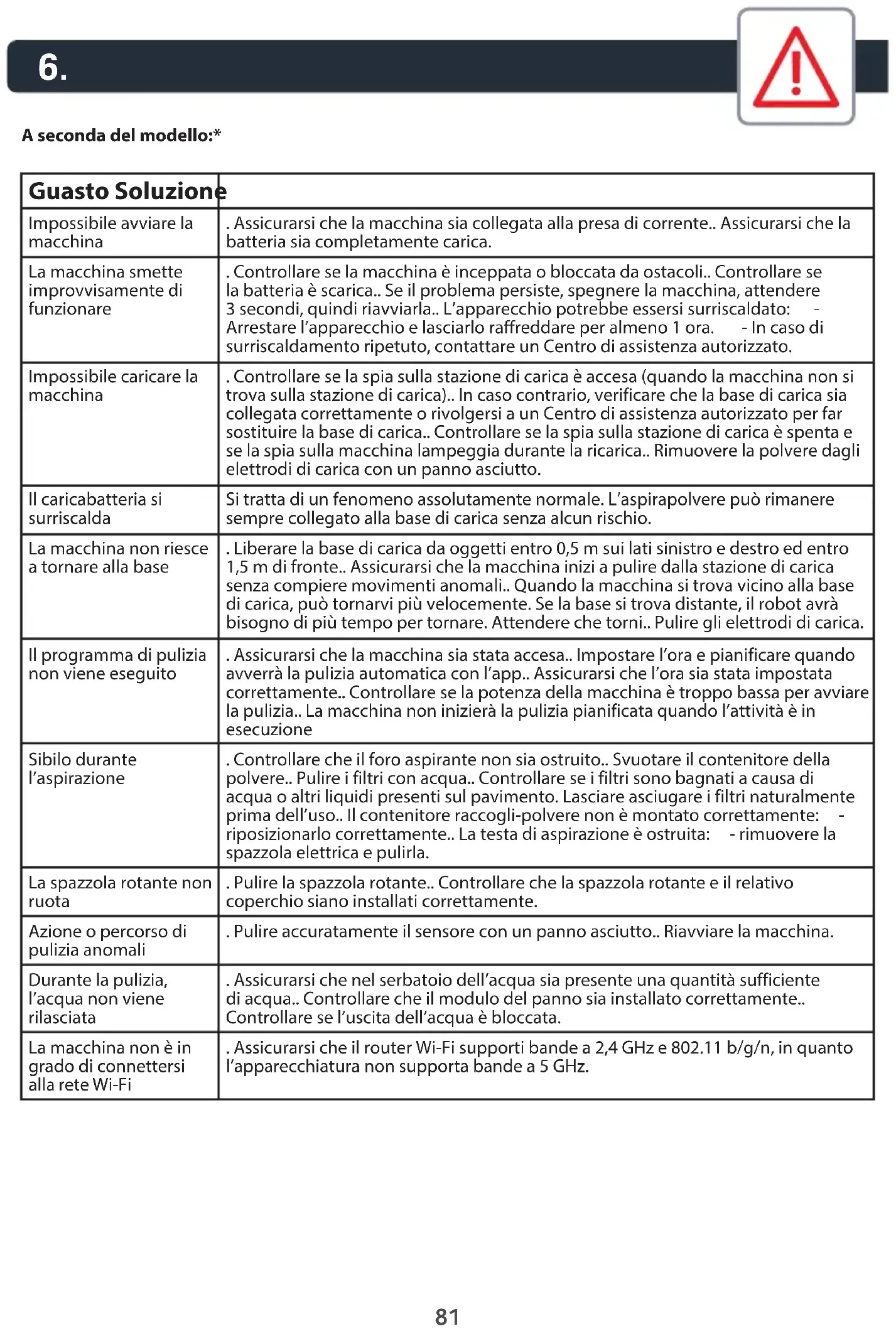 Fehler Lösung Gerät kann nicht gestartet werden . Stellen Sie sicher, dass das Gerät an die Stromversorgung angeschlossen ist. . Stellen Sie sicher, dass der Akku vollständig geladen ist. Gerät funktioniert plötzlich nicht mehr . Prüfen Sie, ob das Gerät blockiert ist oder Hindernisse vorhanden sind. . Prüfen Sie, ob der Akkuladestand zu niedrig ist. . Wenn das Problem weiterhin besteht, schalten Sie das Gerät aus, warten Sie 3Sekunden und schalten Sie es dann wieder ein. . Das Gerät ist möglicherweise überhitzt: –Schalten Sie das Gerät aus, und lassen Sie es mindestens 1Stunde lang abkühlen. –Wenn es sich wiederholt überhitzt, wenden Sie sich an ein zugelassenes Kundendienstcenter. Gerät kann nicht geladen werden . Prüfen Sie, ob die Anzeige an der Ladestation leuchtet (wenn sich der Roboter nicht an der Ladestation befindet). . Ist dies nicht der Fall, überprüfen Sie, ob das Ladegerät ordnungsgemäß angeschlossen wurde, oder wenden Sie sich an ein zugelassenes Kundendienstcenter, um das Ladegerät auszutauschen. . Überprüfen Sie, ob die Anzeige an der Ladestation nicht leuchtet und die Anzeige am Gerät während des Ladevorgangs blinkt. . Wischen Sie die Ladeelektroden mit einem trockenen Tuch ab. Das Ladegerät erhitzt sich Das ist völlig normal. Das Ladegerät kann problemlos dauerhaft an den Saugroboter angeschlossen bleiben. Gerät kann nicht zur Ladestation zurückkehren . Entfernen Sie alle Objekte innerhalb von 0,5m links und rechts sowie innerhalb von 1,5m vor der Ladestation. . Stellen Sie sicher, dass das Gerät ohne ungewöhnliche Bewegung aus der Ladestation ausfährt und den Saugvorgang startet. . Wenn sich das Gerät in der Nähe der Ladestation befindet, kann es schneller zurückkehren. Wenn sich die Ladestation jedoch weit entfernt befindet, benötigt das Gerät mehr Zeit für die Rückkehr. Bitte warten Sie während der Rückkehr. . Reinigen Sie die Ladeelektroden. Der Reinigungsplan wird nicht ausgeführt . Stellen Sie sicher, dass das Gerät eingeschaltet ist. . Stellen Sie die Uhrzeit ein und planen Sie die Zeit für den automatischen Saugvorgang mit der App. . Stellen Sie sicher, dass die Uhrzeit korrekt eingestellt wurde. . Prüfen Sie, ob der Akkuladestand zu niedrig ist, um den Saugvorgang zu starten. . Das Gerät startet keinen geplanten Saugvorgang, wenn die Aufgabe ausgeführt wird. Pfeifgeräusch beim Ansaugen . Prüfen Sie den Ansaugeinlass auf Hindernisse. . Leeren Sie den Staubbehälter. . Reinigen Sie die Filter. . Prüfen Sie, ob die Filter aufgrund von Wasser oder anderen Flüssigkeiten auf dem Boden nass sind. Lassen Sie die Filter vor der Verwendung natürlich und gründlich trocknen. . Der Staubbehälter wurde nicht richtig eingesetzt: –Setzen Sie ihn korrekt ein. . –Der Einlass ist verstopft: –Entfernen Sie die Bürste und reinigen Sie ihn. Die Rollbürste dreht sich nicht . Reinigen Sie die Rollbürste. . Prüfen Sie, ob die Bürstenrolle und die Bürstenabdeckung korrekt eingesetzt sind. Anormales Verhalten oder anormaler Saugpfad des Roboters . Reinigen Sie den Sensor vorsichtig mit einem trockenen Tuch. . Starten Sie den Roboter neu. Beim Wischen wird kein Wasser freigesetzt . Stellen Sie sicher, dass sich ausreichend Wasser im Wassertank befindet. . Überprüfen Sie, ob das Mopp-Modul korrekt eingesetzt ist. . Prüfen Sie, ob der Wasserauslass blockiert ist. Der Roboter kann keine Verbindung zu Ihrem WLAN-Netzwerk herstellen . Stellen Sie sicher, dass Ihr WLAN-Router 2,4-GHz- und 802.11 b/g/n-Bänder unterstützt, da dieses Gerät keine 5-GHz-Bänder unterstützt.85